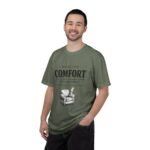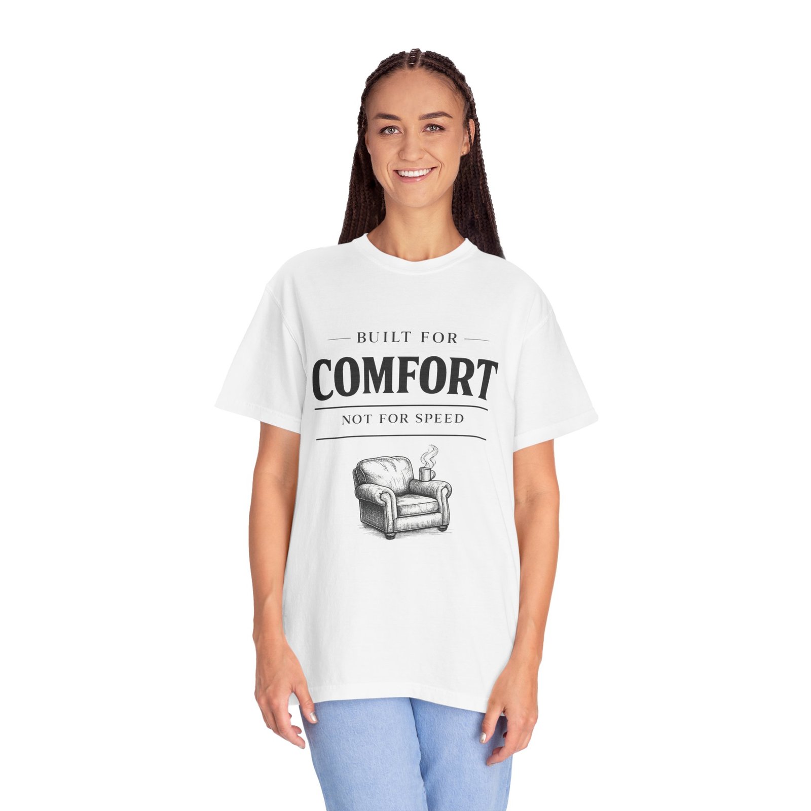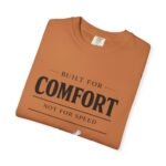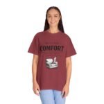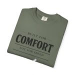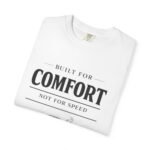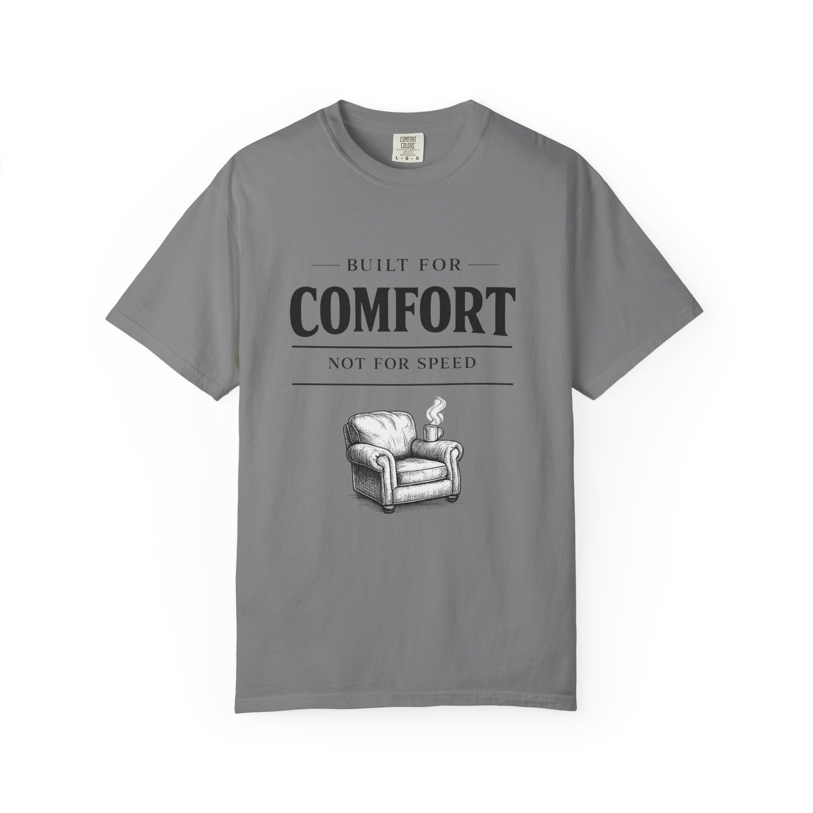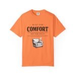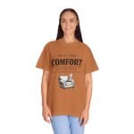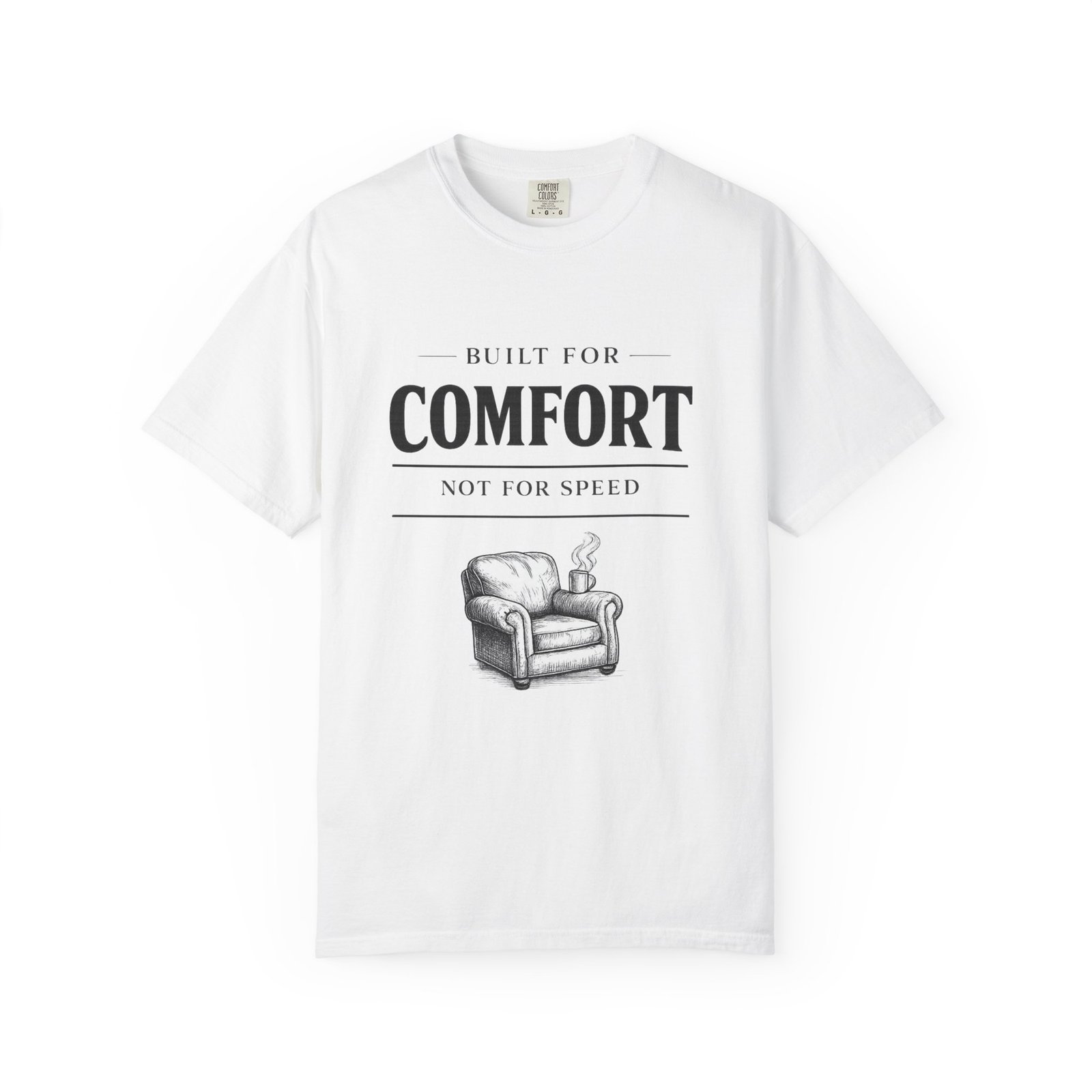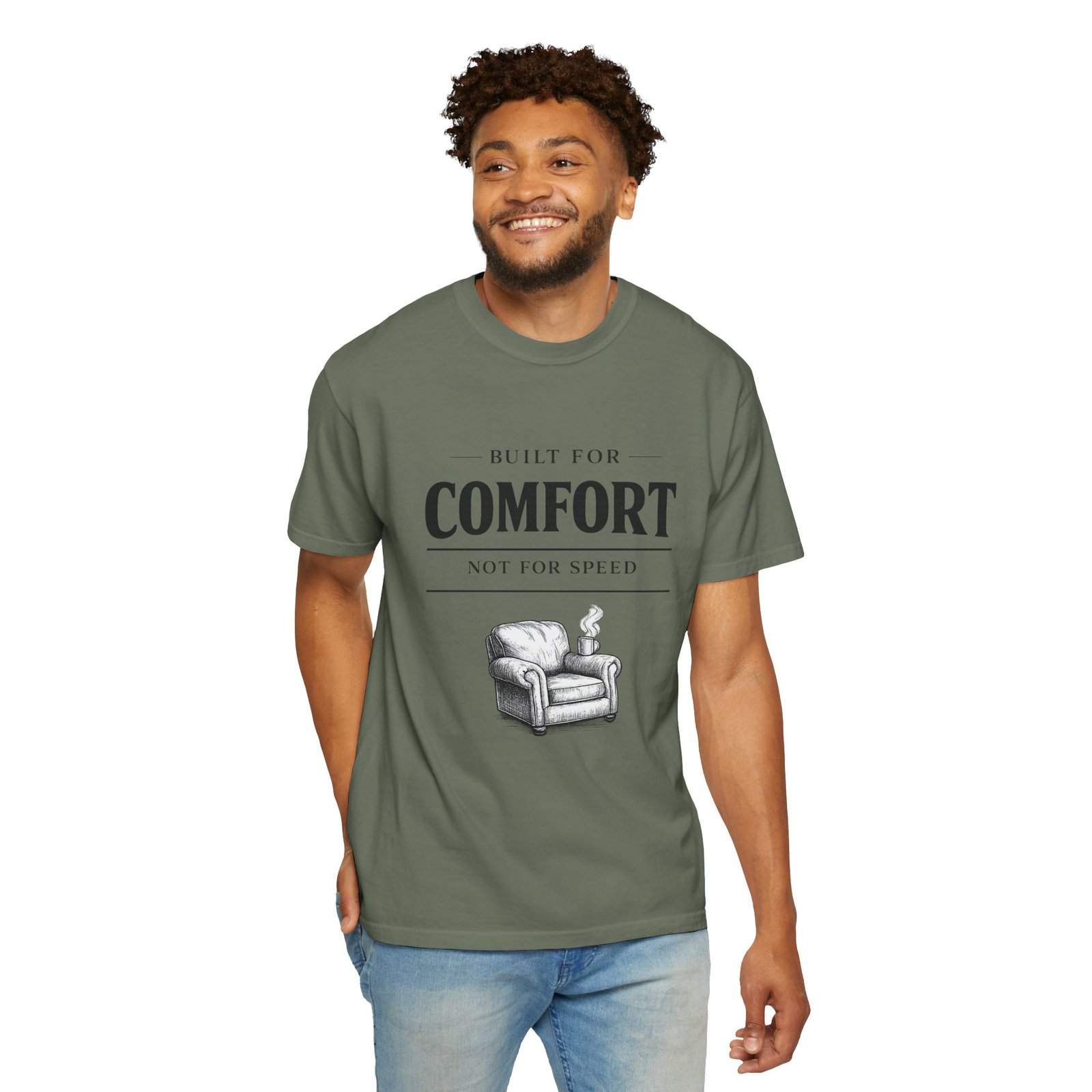 A relaxed, garment-dyed tee that reads like a cozy invitation. Soft, heavyweight cotton and a lived-in color give this shirt the feel of an old favorite from the first wear. The front print — a hand-drawn armchair with a steaming mug and the words “Built for Comfort / Not for Speed” — speaks to slow evenings, quiet routines, and the small rituals that make home feel like home. Wear it on weekend mornings with sweatpants and a slow brew, layer it under a flannel for porch reading sessions, or pack it for a low-key cabin weekend. The roomy cut and durable construction mean it moves with you, washes well, and keeps that softened, broken-in look you’ll reach for again and again.