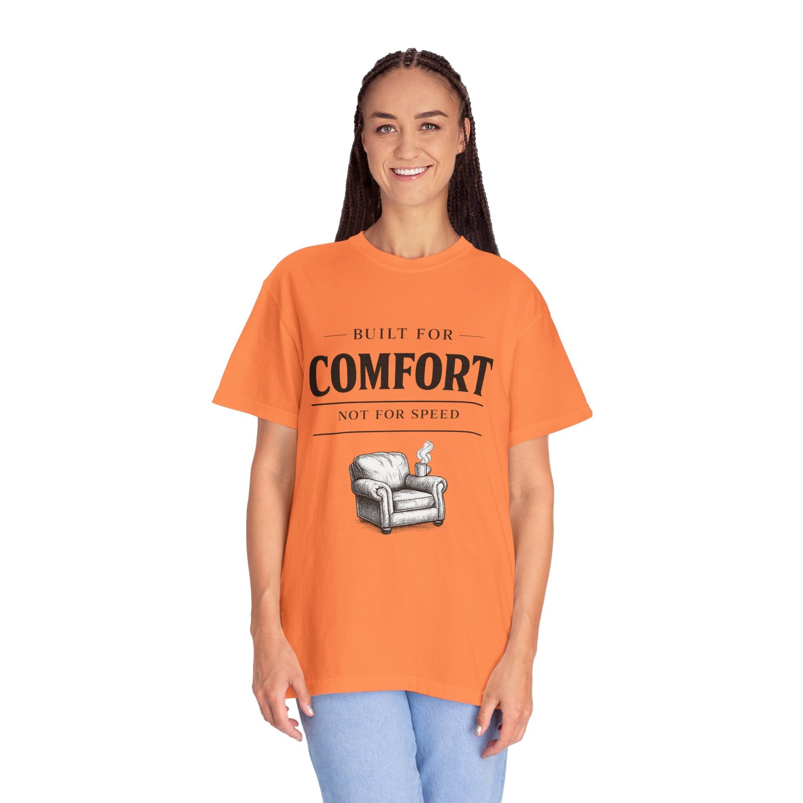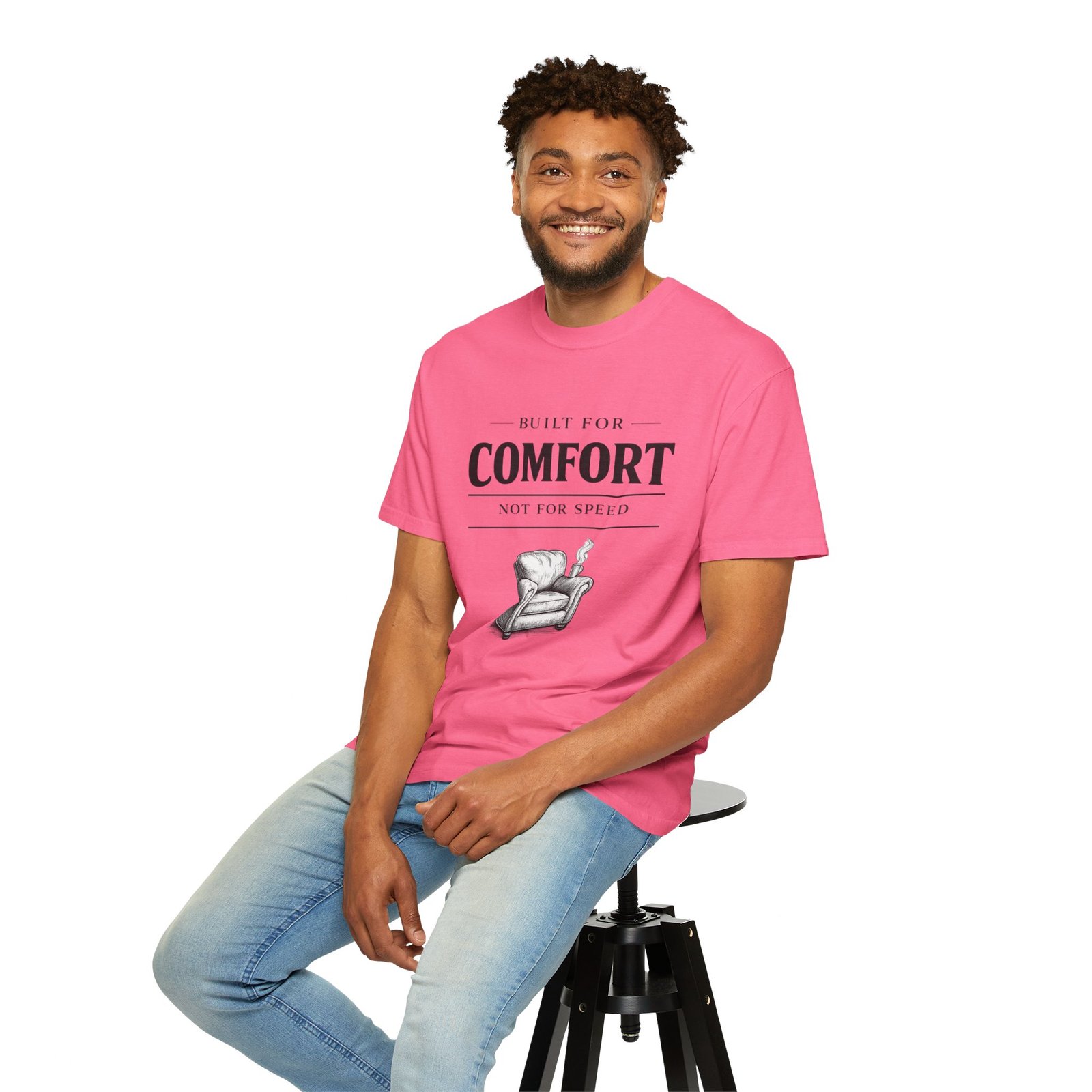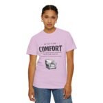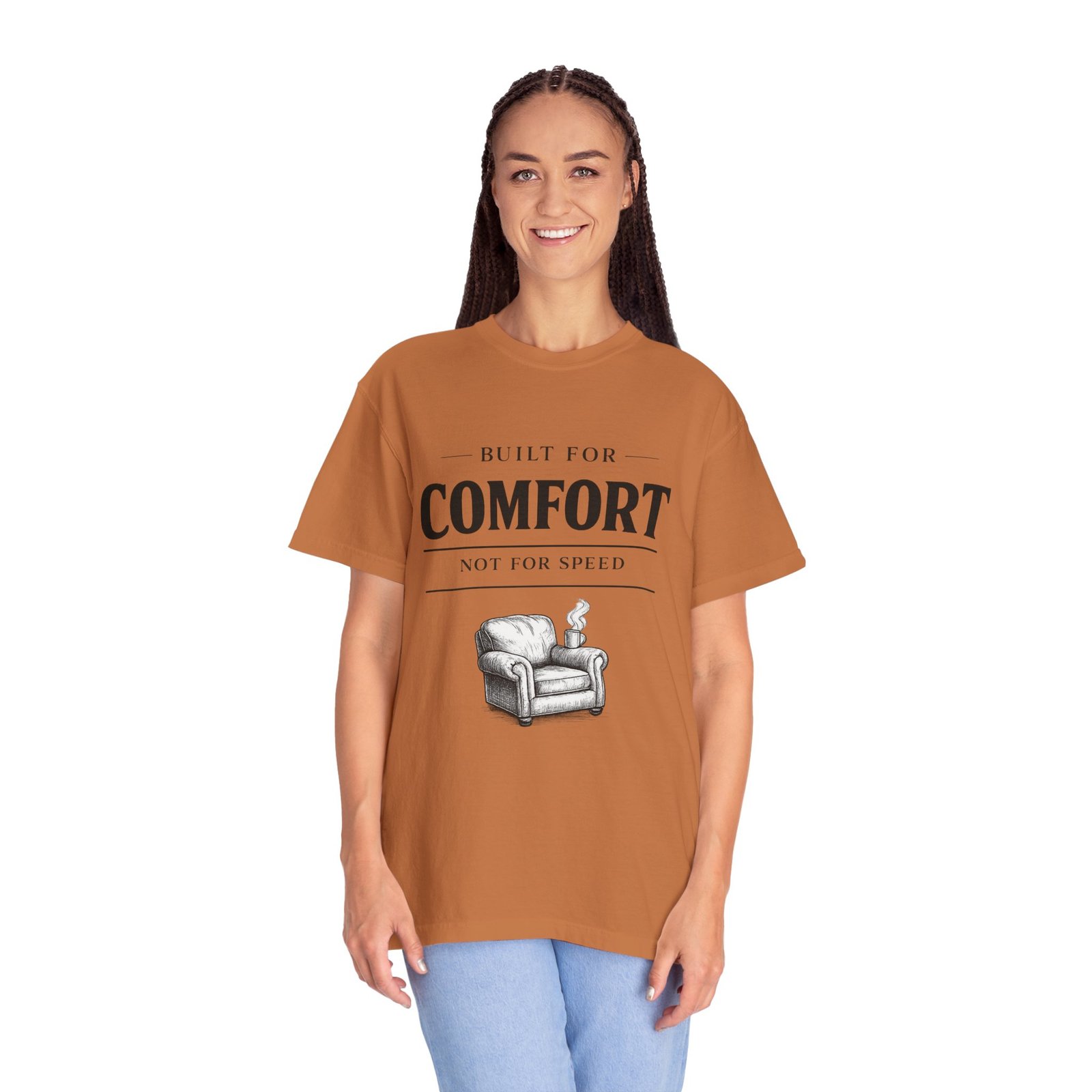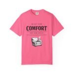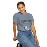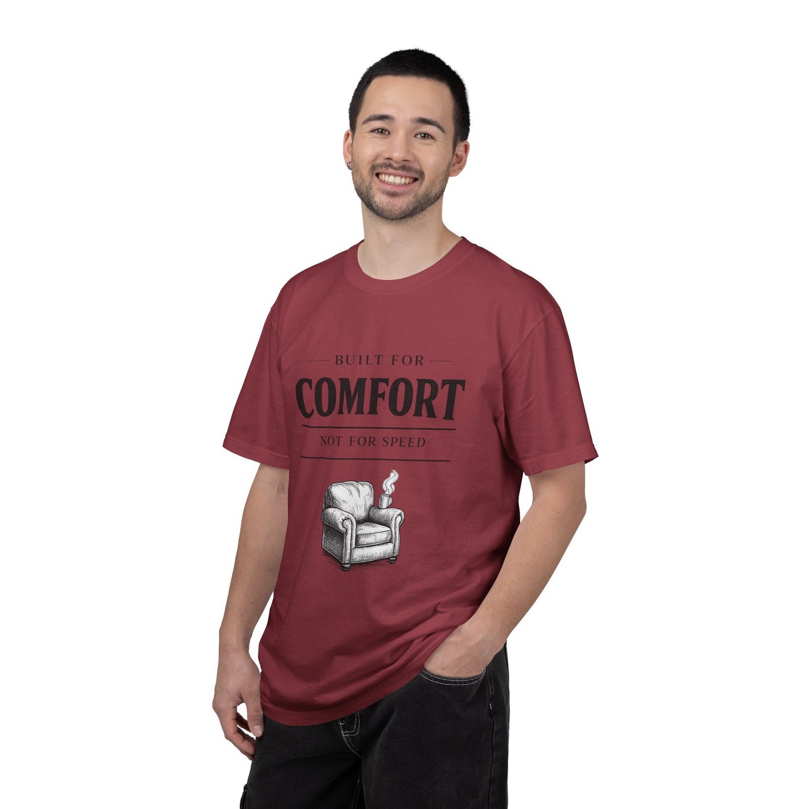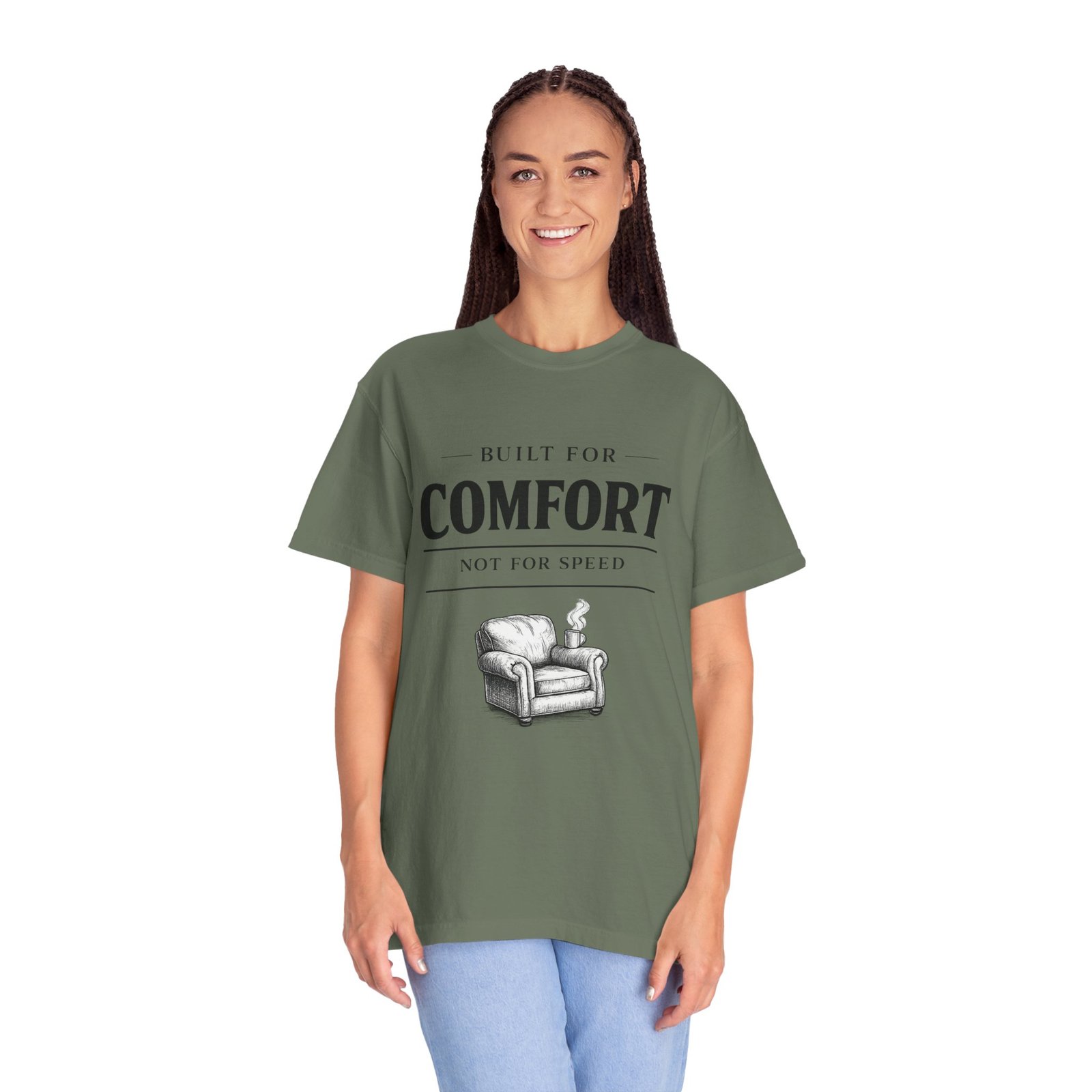 A relaxed, garment-dyed tee that reads like a cozy invitation. Soft, heavyweight cotton and a lived-in color give this shirt the feel of an old favorite from the first wear. The front print — a hand-drawn armchair with a steaming mug and the words “Built for Comfort / Not for Speed” — speaks to slow evenings, quiet routines, and the small rituals that make home feel like home. Wear it on weekend mornings with sweatpants and a slow brew, layer it under a flannel for porch reading sessions, or pack it for a low-key cabin weekend. The roomy cut and durable construction mean it moves with you, washes well, and keeps that softened, broken-in look you’ll reach for again and again.