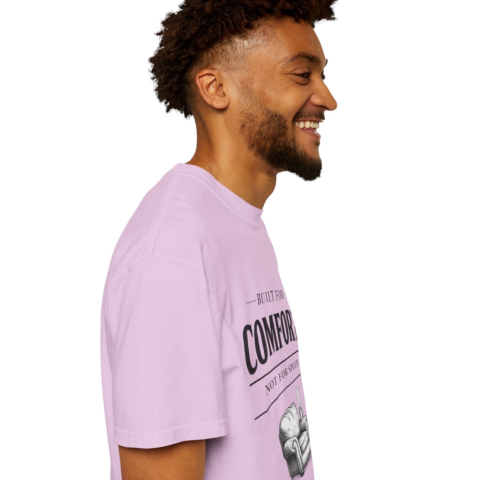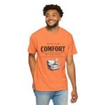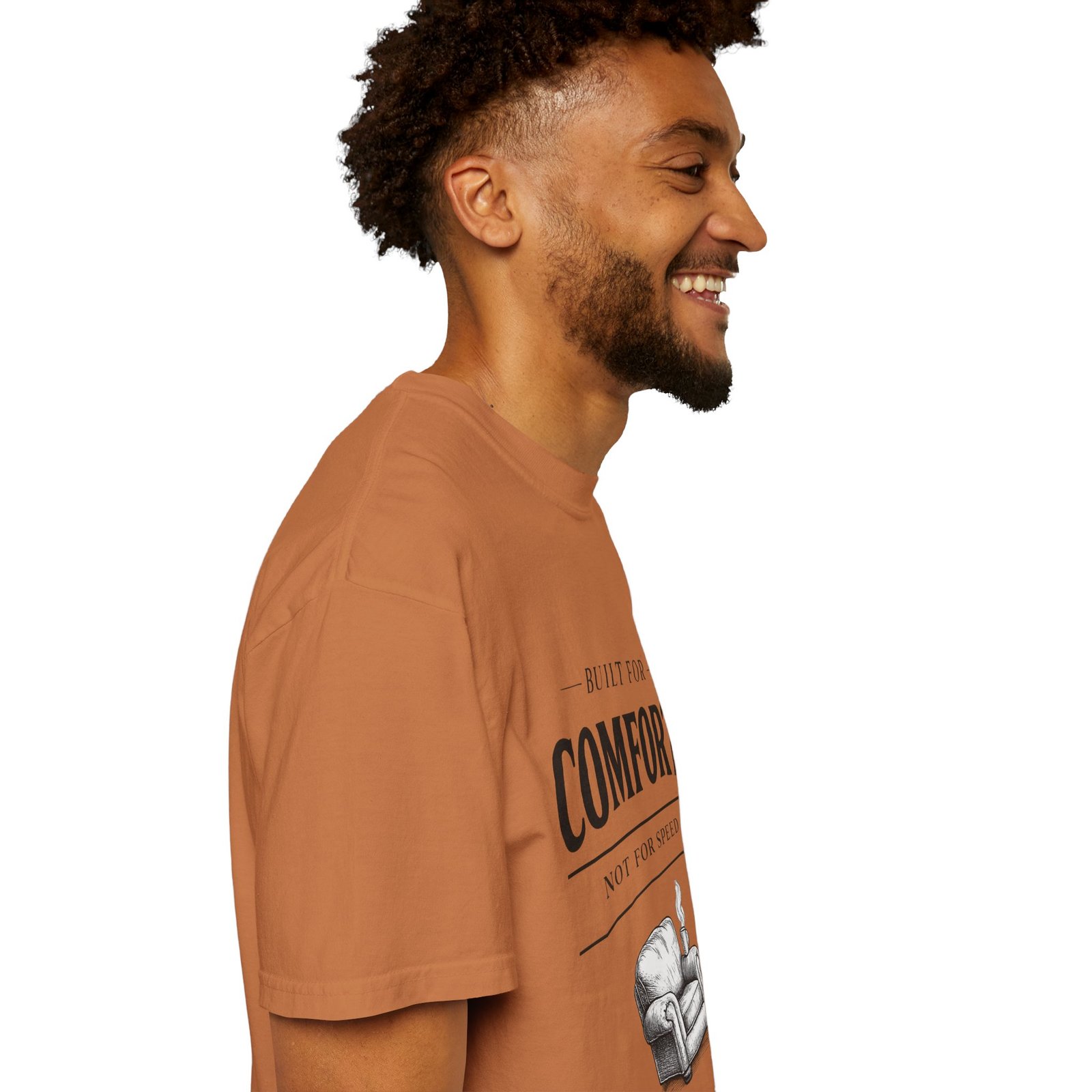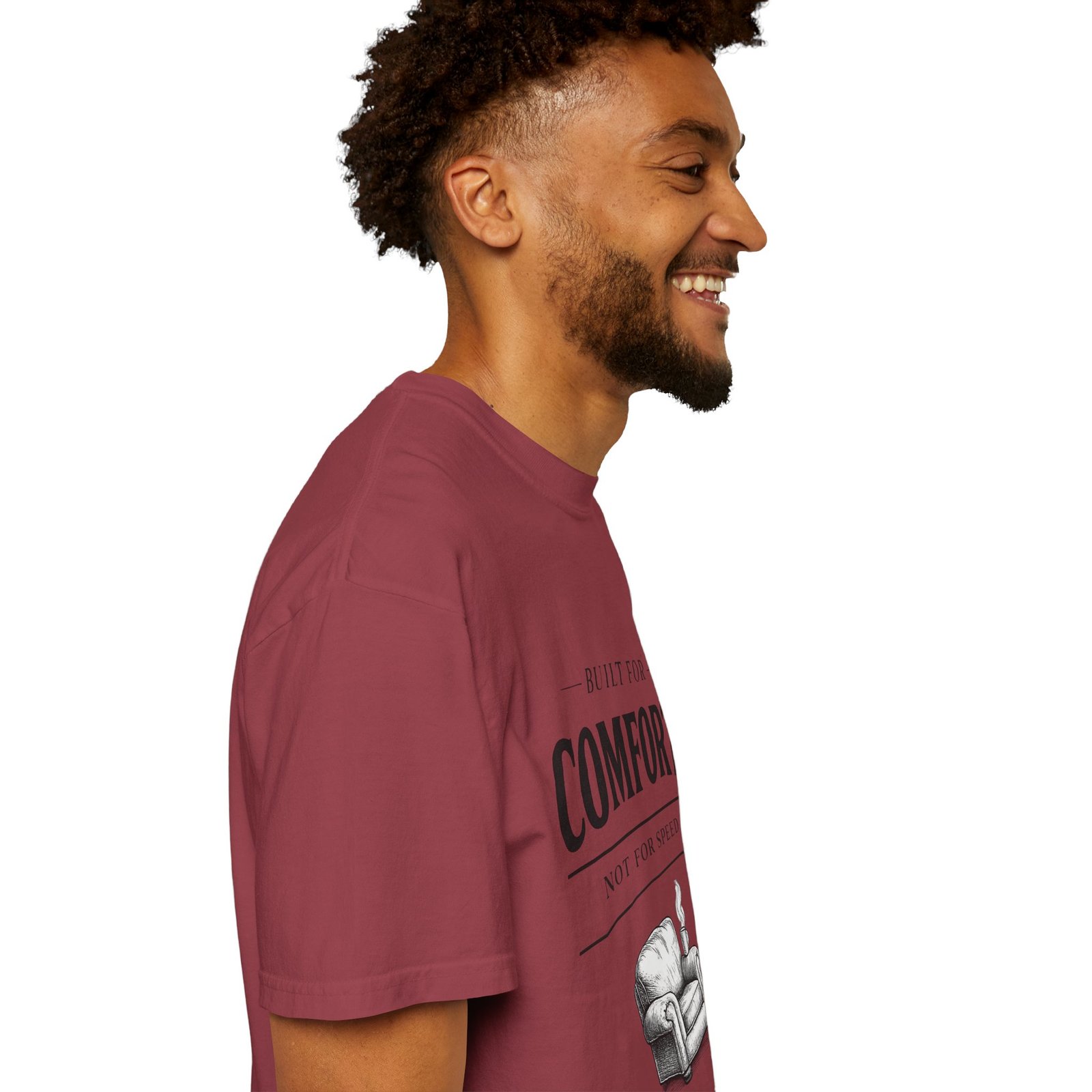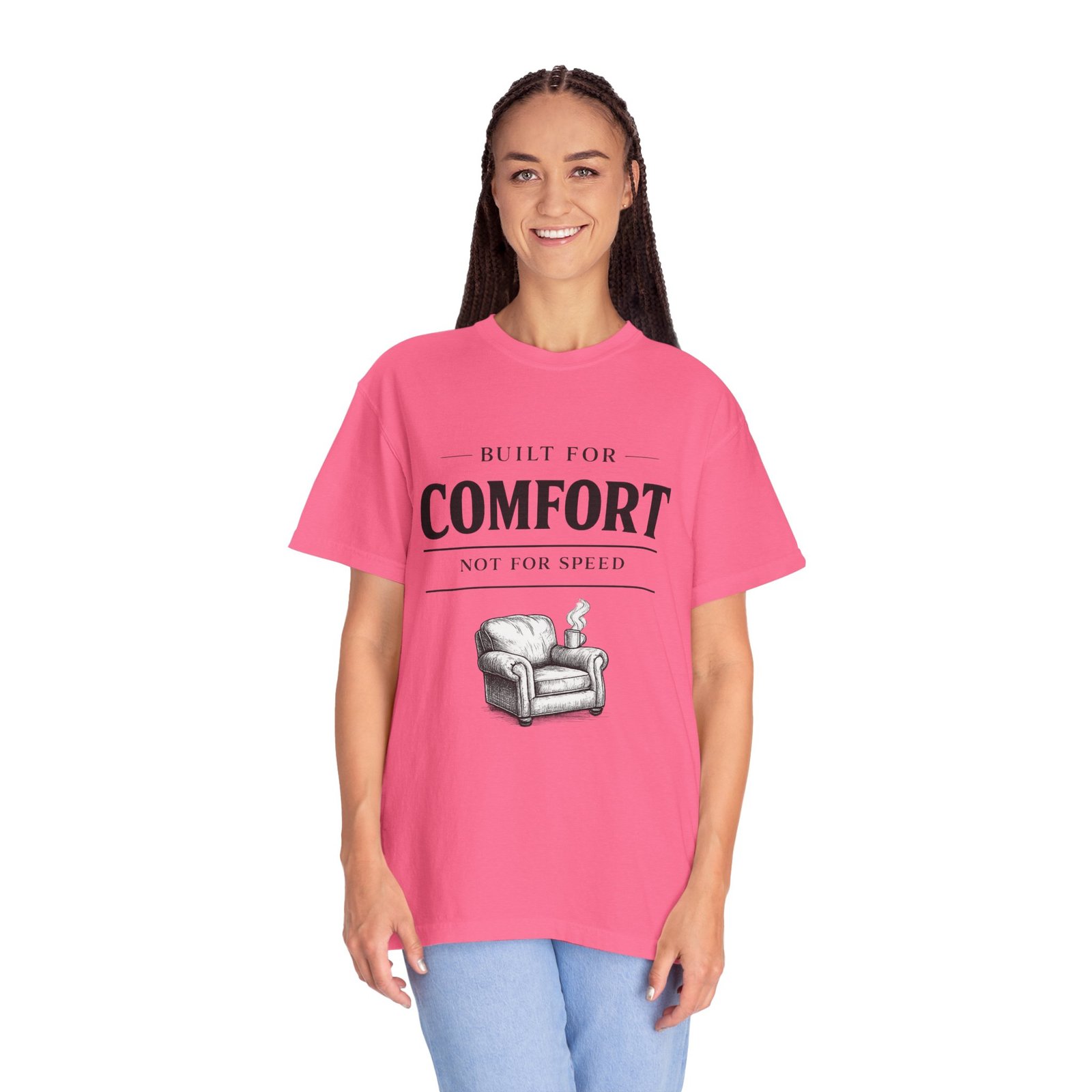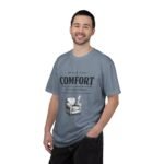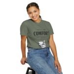 A relaxed, garment-dyed tee that reads like a cozy invitation. Soft, heavyweight cotton and a lived-in color give this shirt the feel of an old favorite from the first wear. The front print — a hand-drawn armchair with a steaming mug and the words “Built for Comfort / Not for Speed” — speaks to slow evenings, quiet routines, and the small rituals that make home feel like home. Wear it on weekend mornings with sweatpants and a slow brew, layer it under a flannel for porch reading sessions, or pack it for a low-key cabin weekend. The roomy cut and durable construction mean it moves with you, washes well, and keeps that softened, broken-in look you’ll reach for again and again.