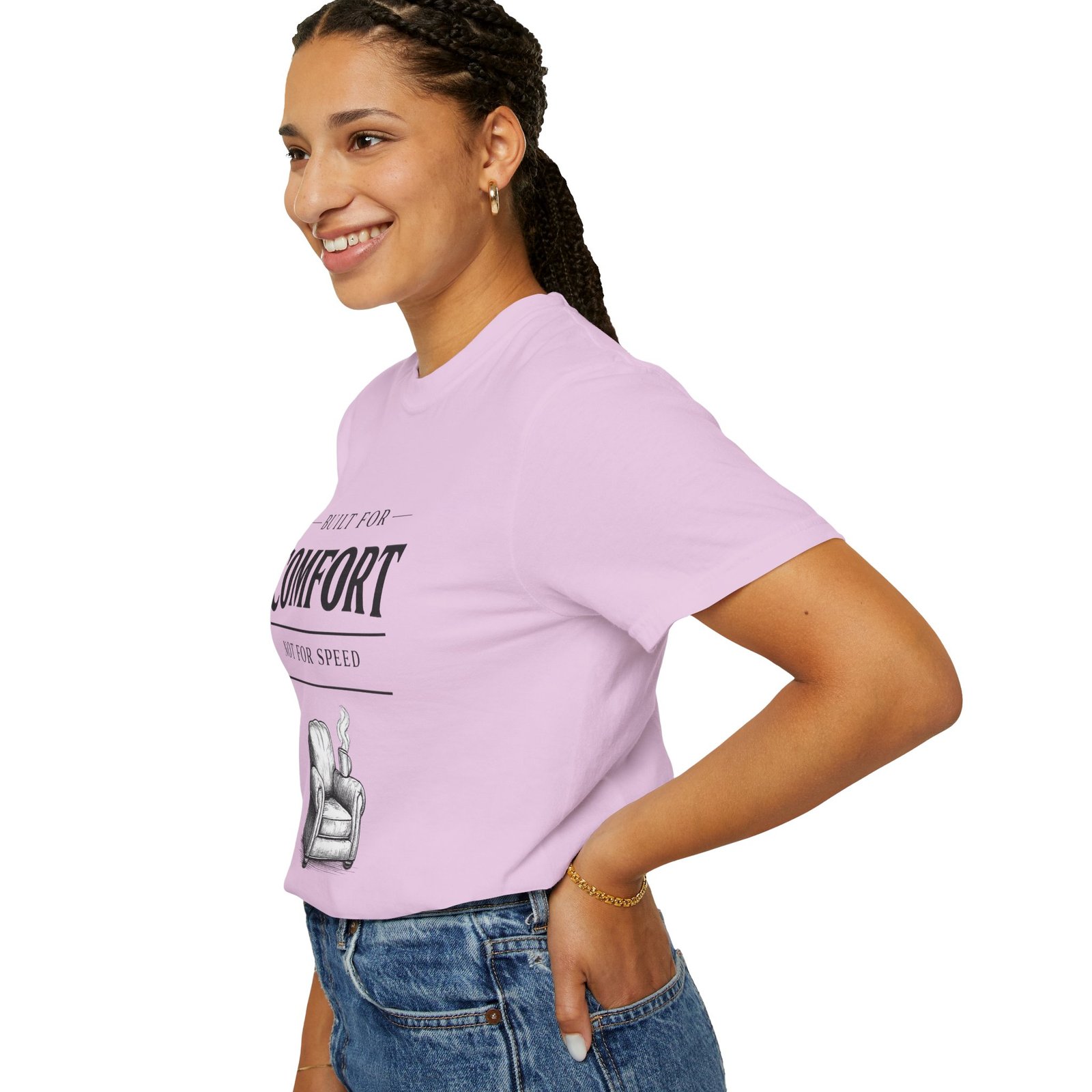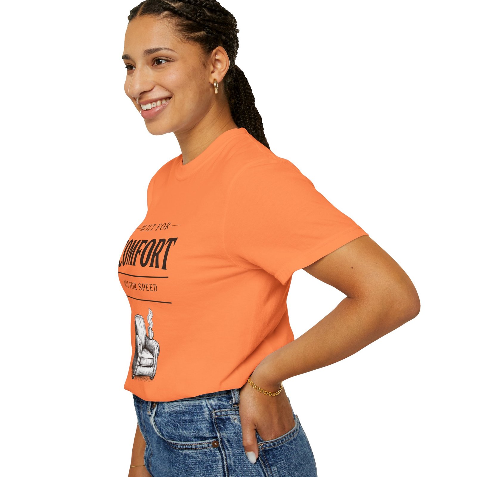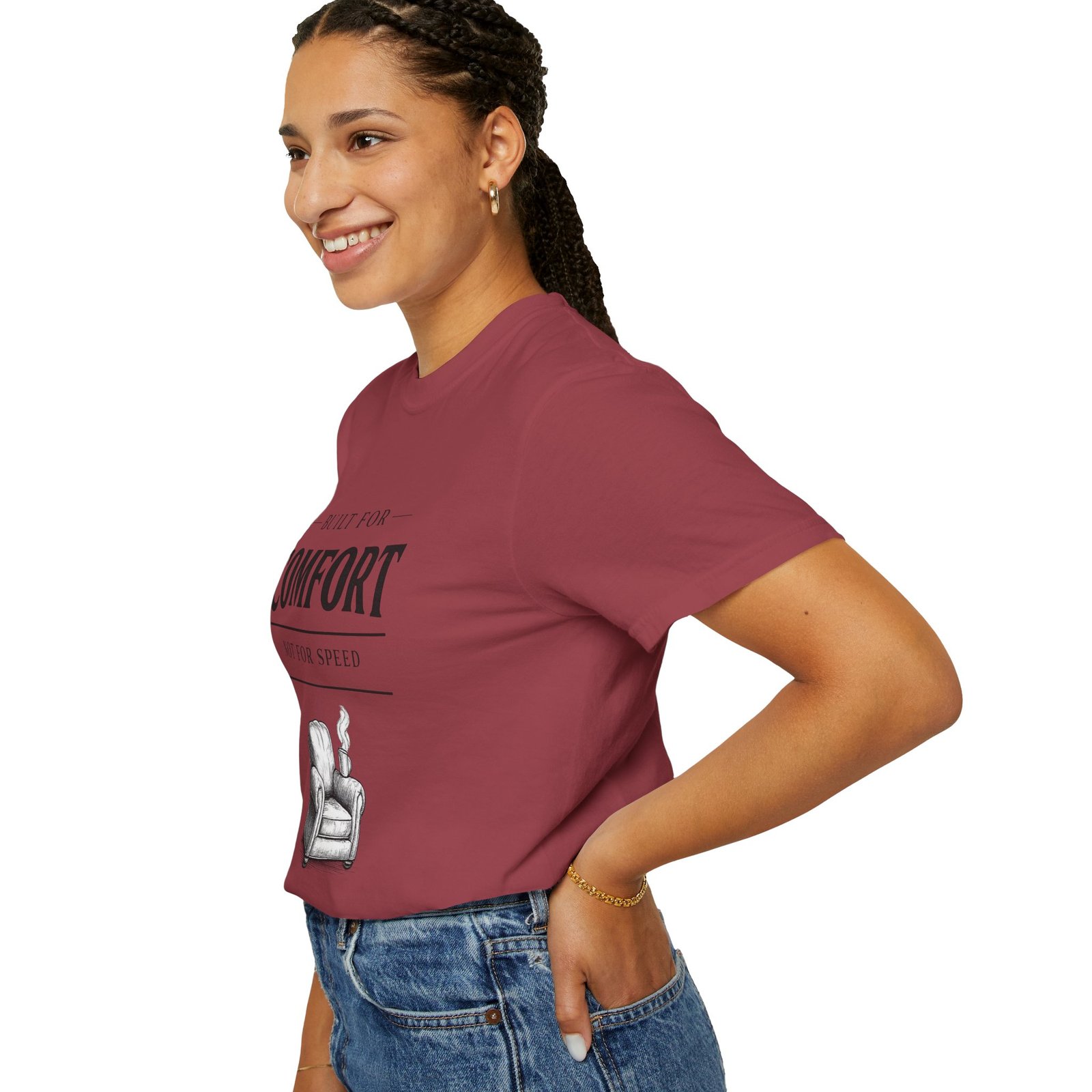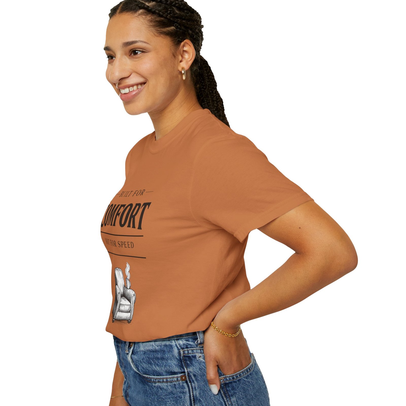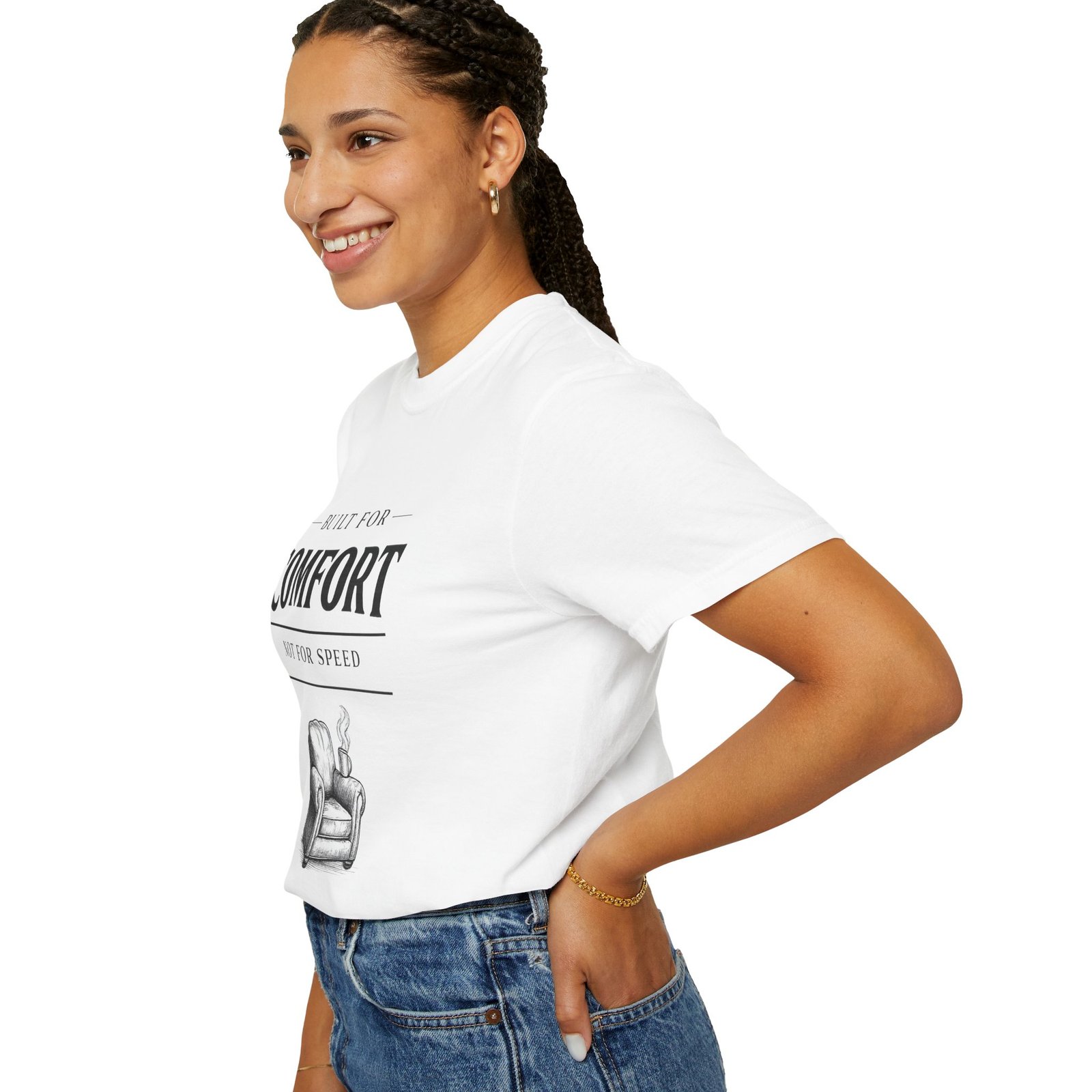 A relaxed, garment-dyed tee that reads like a cozy invitation. Soft, heavyweight cotton and a lived-in color give this shirt the feel of an old favorite from the first wear. The front print — a hand-drawn armchair with a steaming mug and the words “Built for Comfort / Not for Speed” — speaks to slow evenings, quiet routines, and the small rituals that make home feel like home. Wear it on weekend mornings with sweatpants and a slow brew, layer it under a flannel for porch reading sessions, or pack it for a low-key cabin weekend. The roomy cut and durable construction mean it moves with you, washes well, and keeps that softened, broken-in look you’ll reach for again and again.