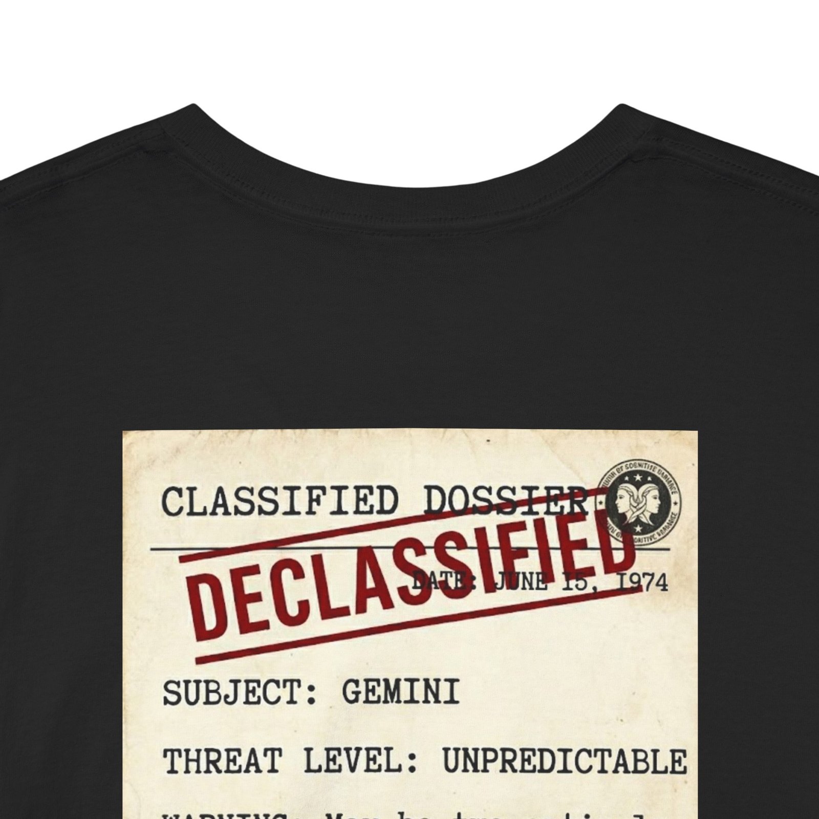 This relaxed-fit tee brings a laid-back, vintage-memoir vibe to everyday wear. The soft, midweight cotton holds a bold back print that looks like a worn, declassified dossierโaged paper tones, stamped markings, and typewriter textโso it reads like a quiet secret carried on your back. Wear it when you want your outfit to whisper a story: late-night stakeouts, coffee-shop plotting, band practice, or wandering city streets at dusk. The crew neck and classic silhouette sit comfortably under a jacket or stand alone as a statement piece. Colors with subtle flecks or heathered texture add an authentic, lived-in feel that complements the printed โdocumentโ graphic.