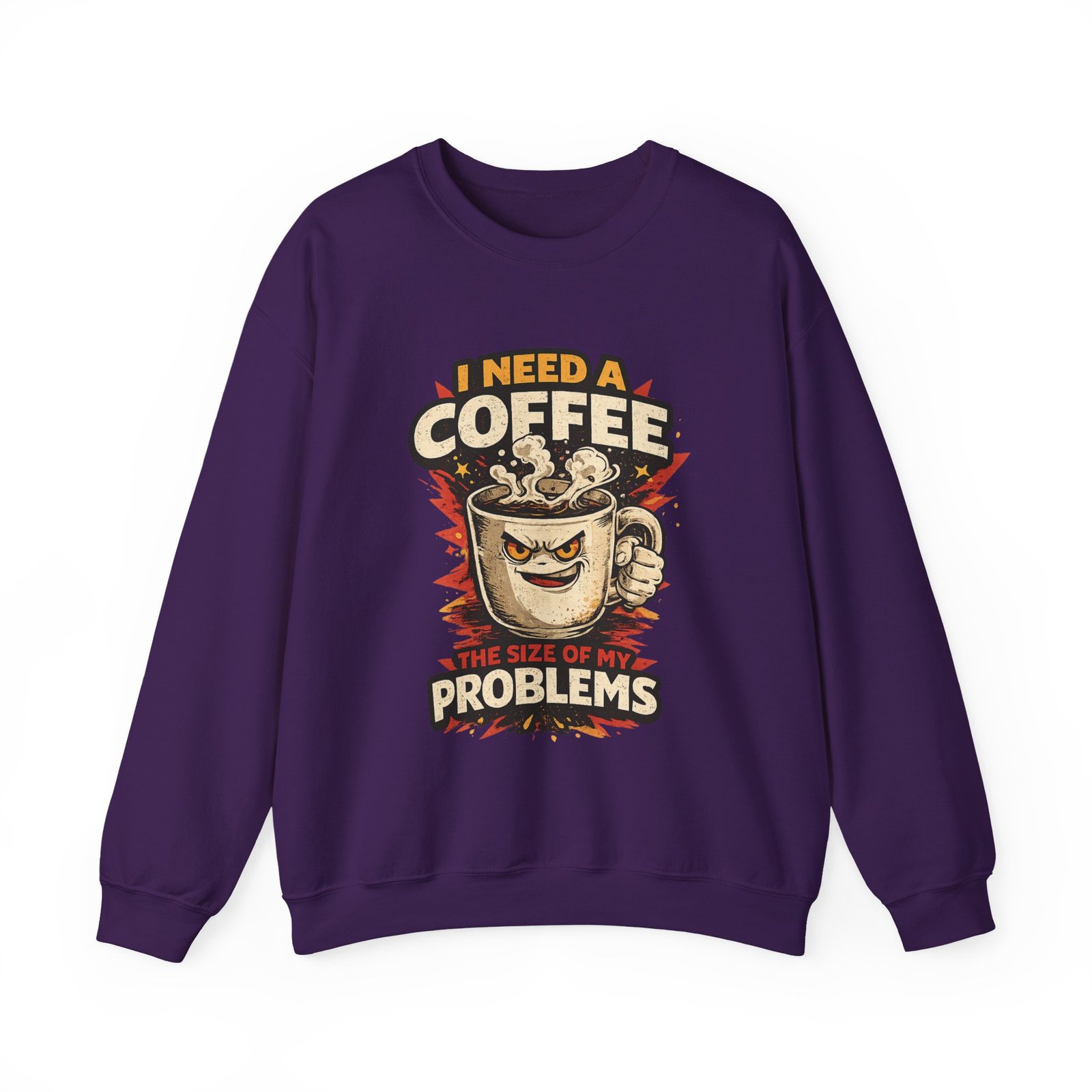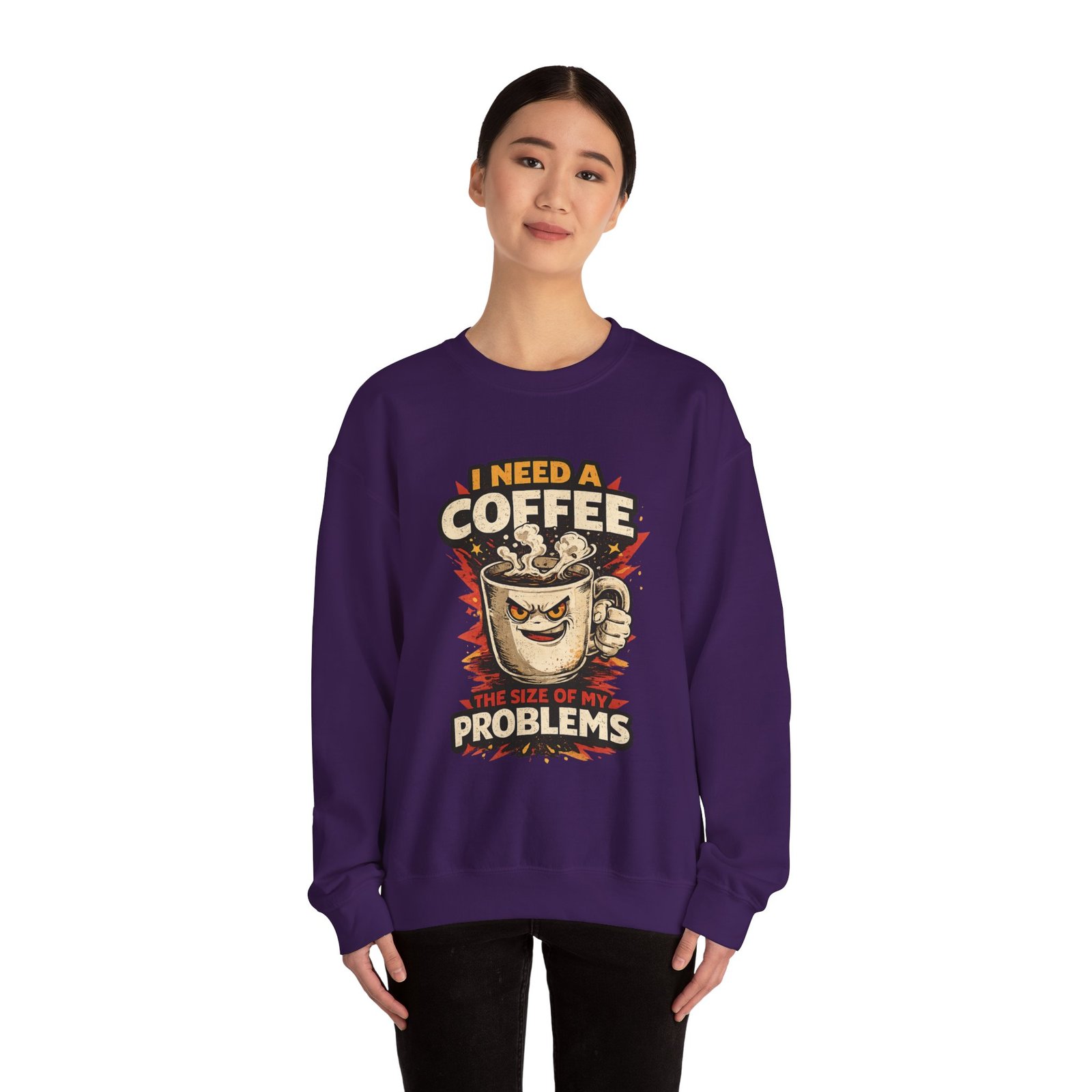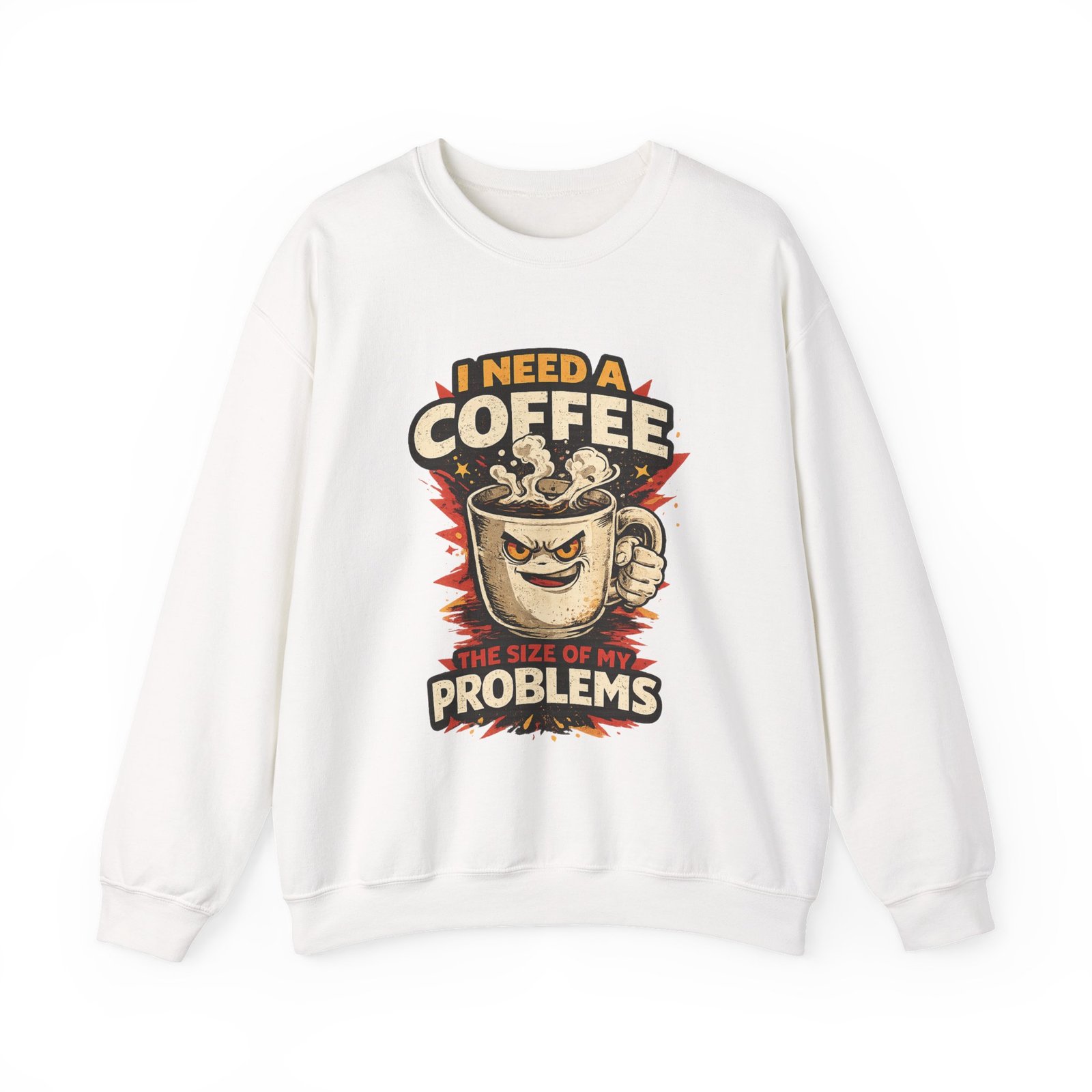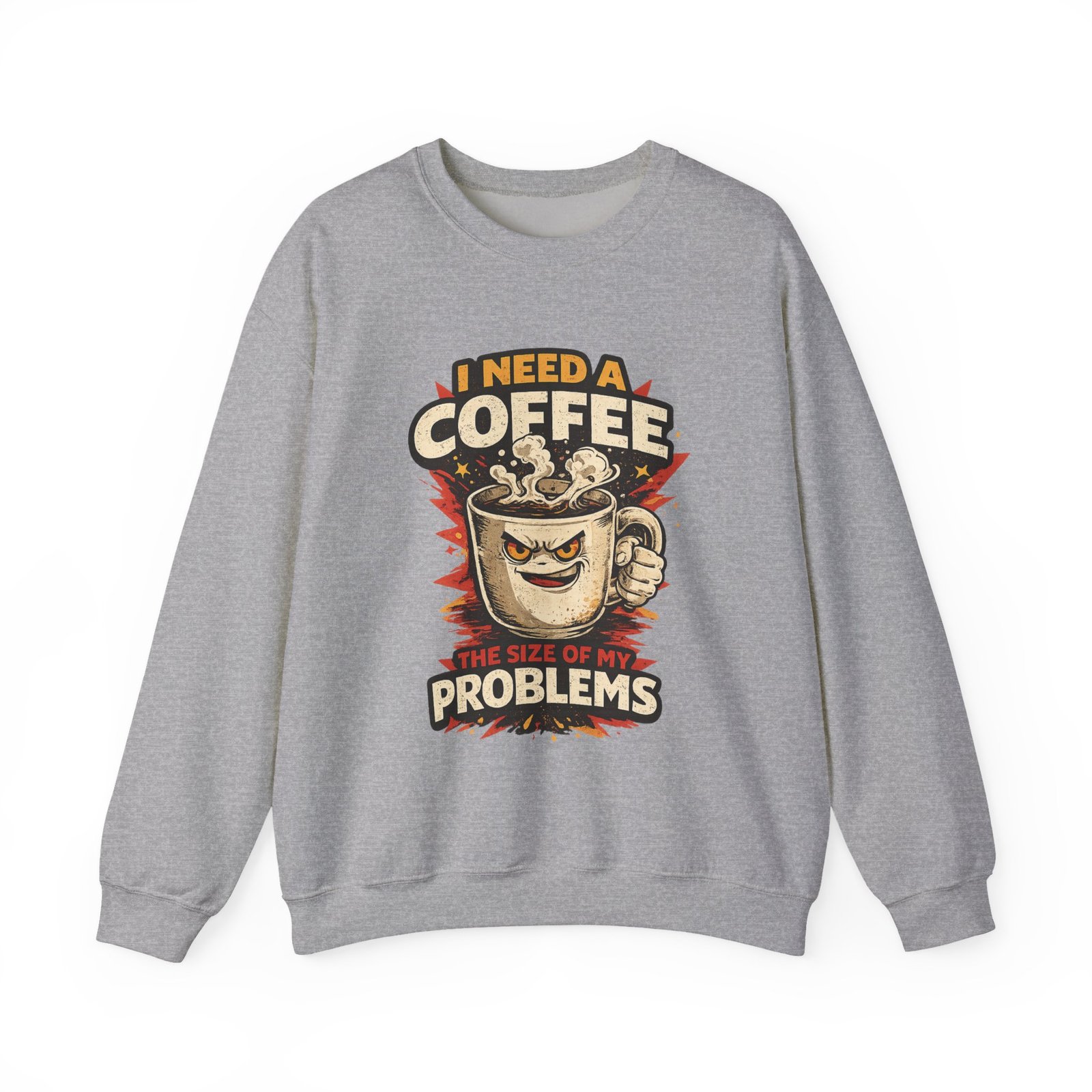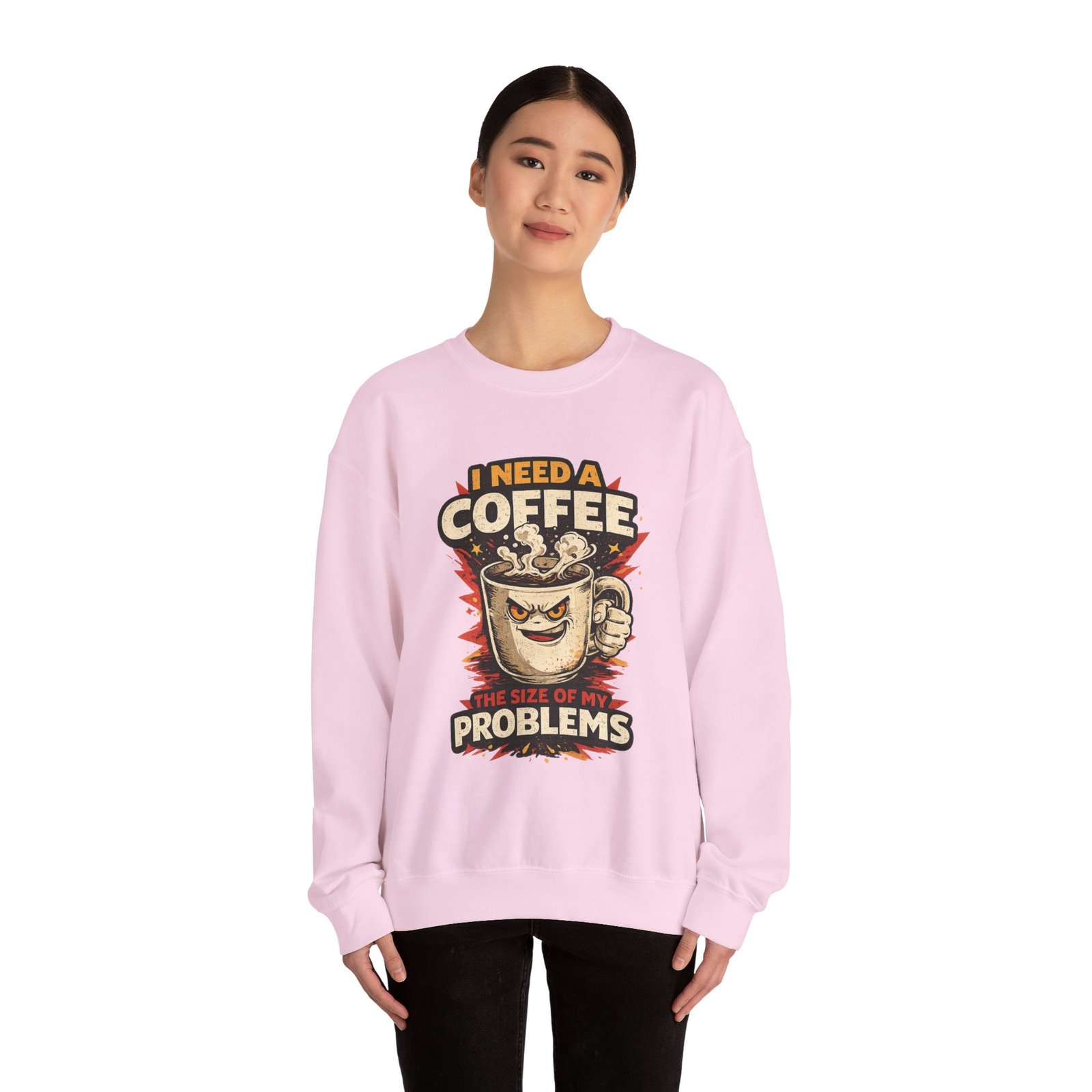 This cozy crewneck blends vintage attitude with everyday comfort. Crafted from a medium-heavy 50/50 cottonβpolyester blend, the sweatshirt features a bold, retro coffee graphic on the front β a steaming mug with attitude and the headline βI need a coffee the size of my problems.β The classic crew neckline, ribbed collar and cuffs, and tubular knit body create a clean silhouette that layers easily and keeps its shape. Thoughtful details like durable double-needle stitching, a pearlized tear-away label, and OEKO-TEX certified dyes elevate the wearability. Itβs grown with ethically sourced US cotton and assembled with care, delivering a soft, lived-in feel from the first wear.