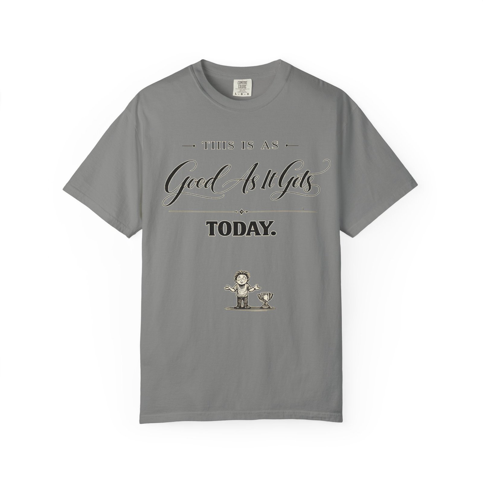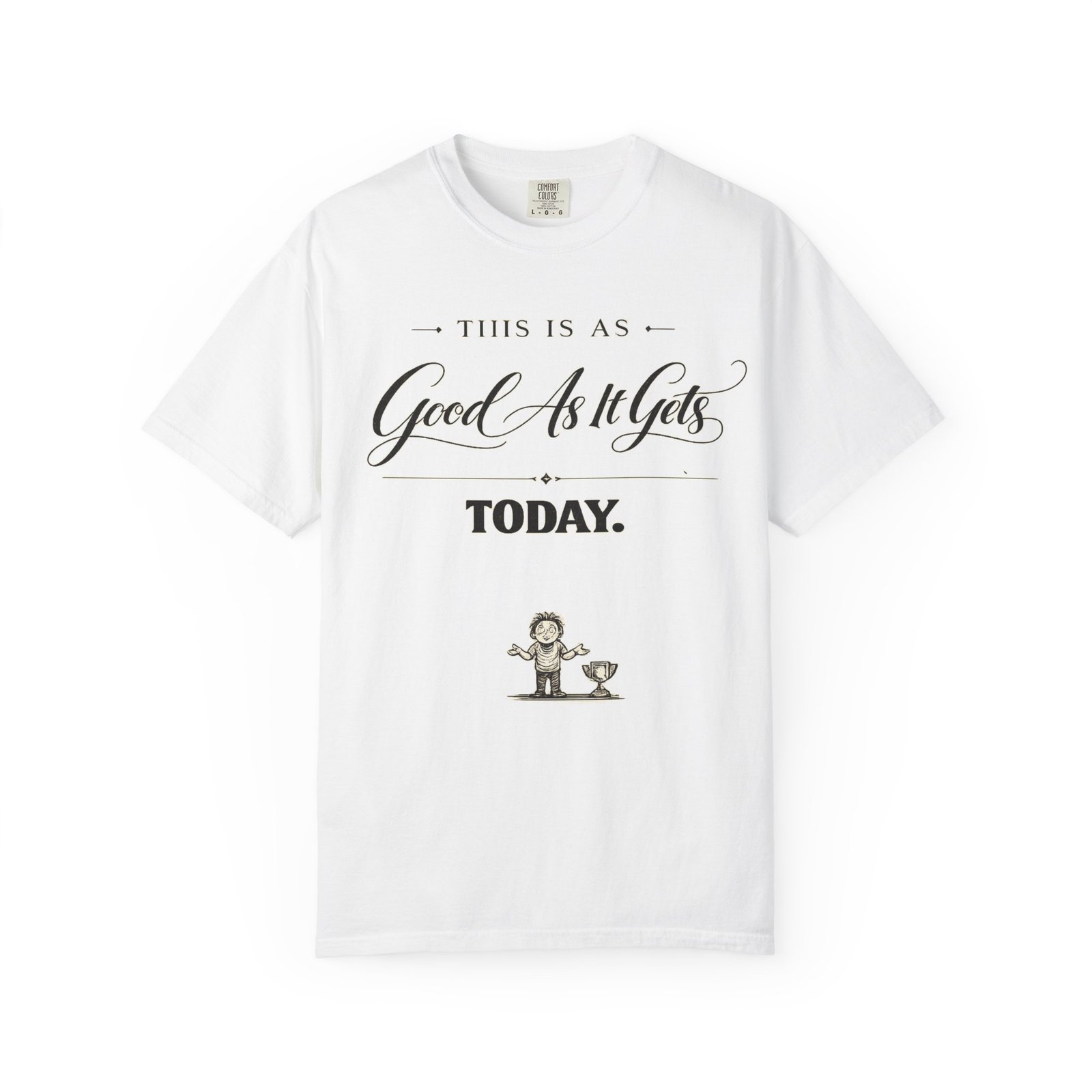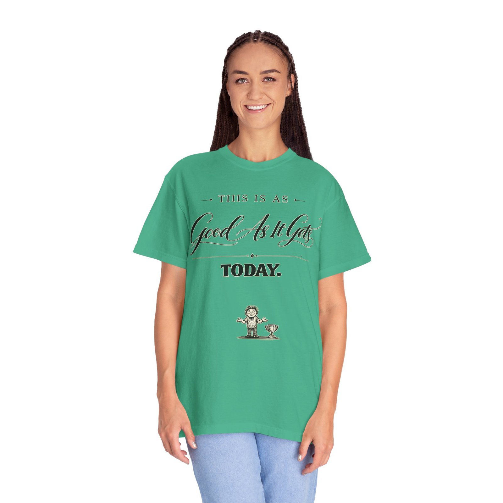 Soft, lived-in, and quietly confident — this garment-dyed tee reads like a little pep talk you can wear. The front features a graceful script that says “This is as Good As It Gets. TODAY.” with a small, charming illustration beneath. It’s the kind of shirt you reach for when you want calm, humor, and a reminder to breathe and appreciate the moment. The heavyweight cotton has a gentle, broken-in texture from the post-construction dye, so color and softness settle in like an old favorite. Cut for a relaxed fit and available in a wide range of shades and sizes, it layers easily under a jacket or stands alone with jeans for a low-key, intentional look.