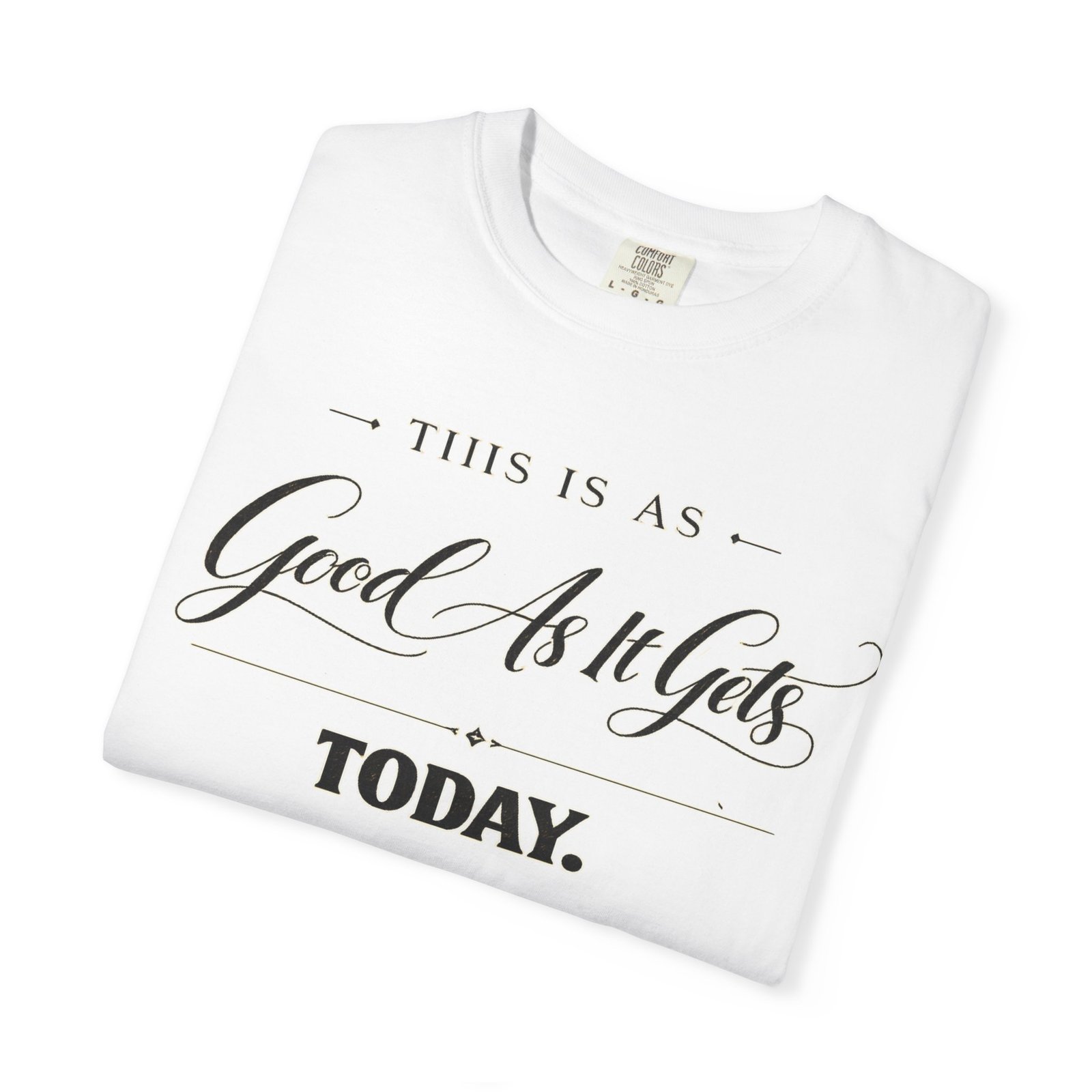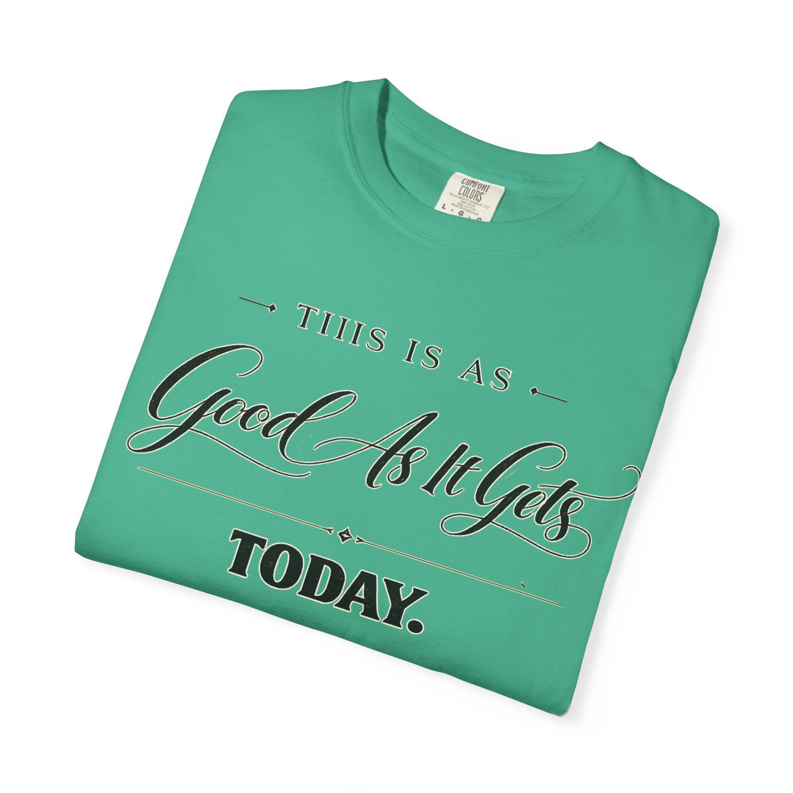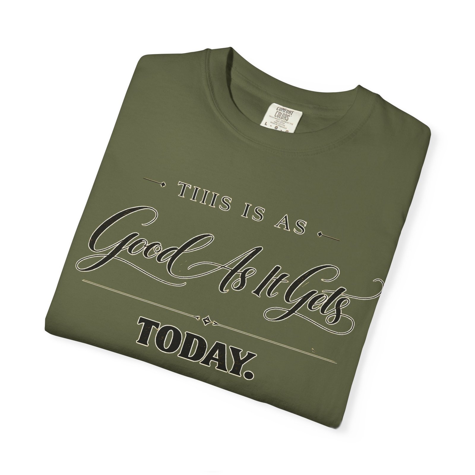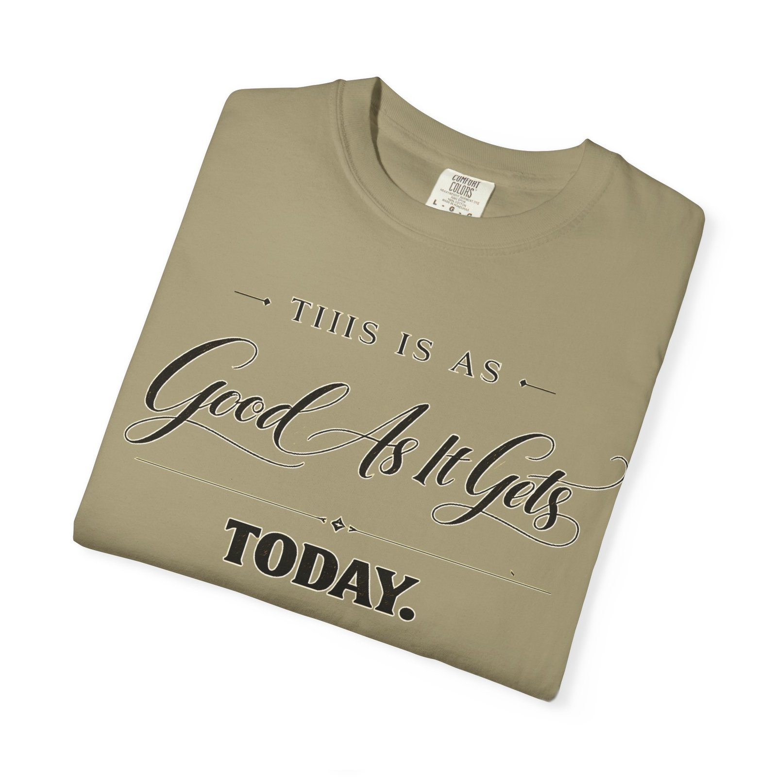 Soft, lived-in, and quietly confident — this garment-dyed tee reads like a little pep talk you can wear. The front features a graceful script that says “This is as Good As It Gets. TODAY.” with a small, charming illustration beneath. It’s the kind of shirt you reach for when you want calm, humor, and a reminder to breathe and appreciate the moment. The heavyweight cotton has a gentle, broken-in texture from the post-construction dye, so color and softness settle in like an old favorite. Cut for a relaxed fit and available in a wide range of shades and sizes, it layers easily under a jacket or stands alone with jeans for a low-key, intentional look.