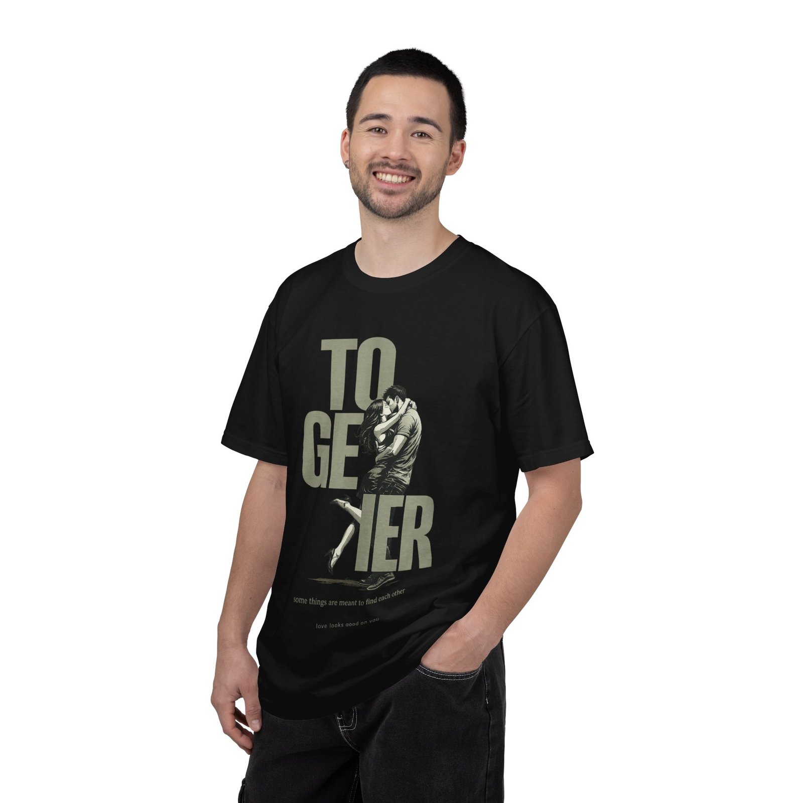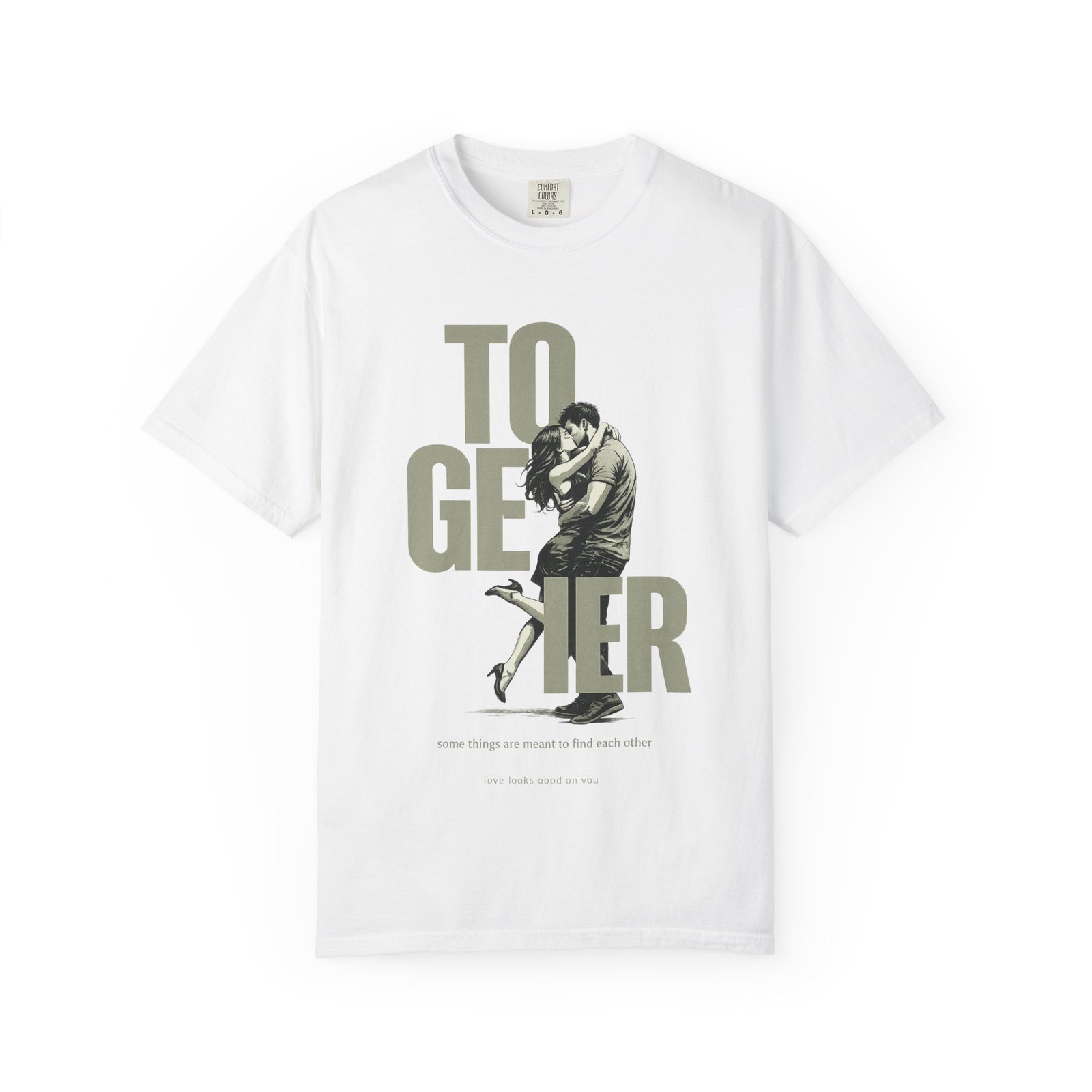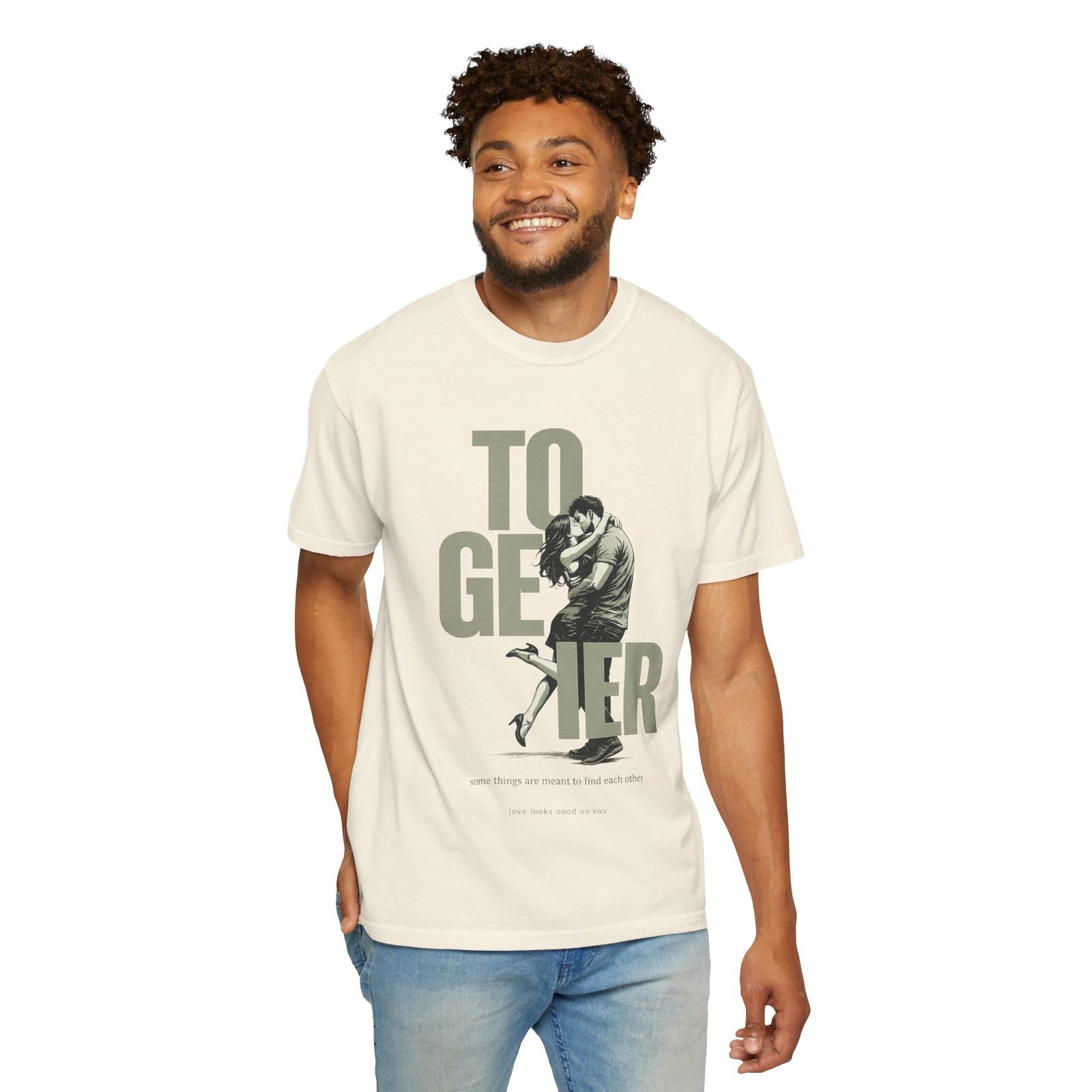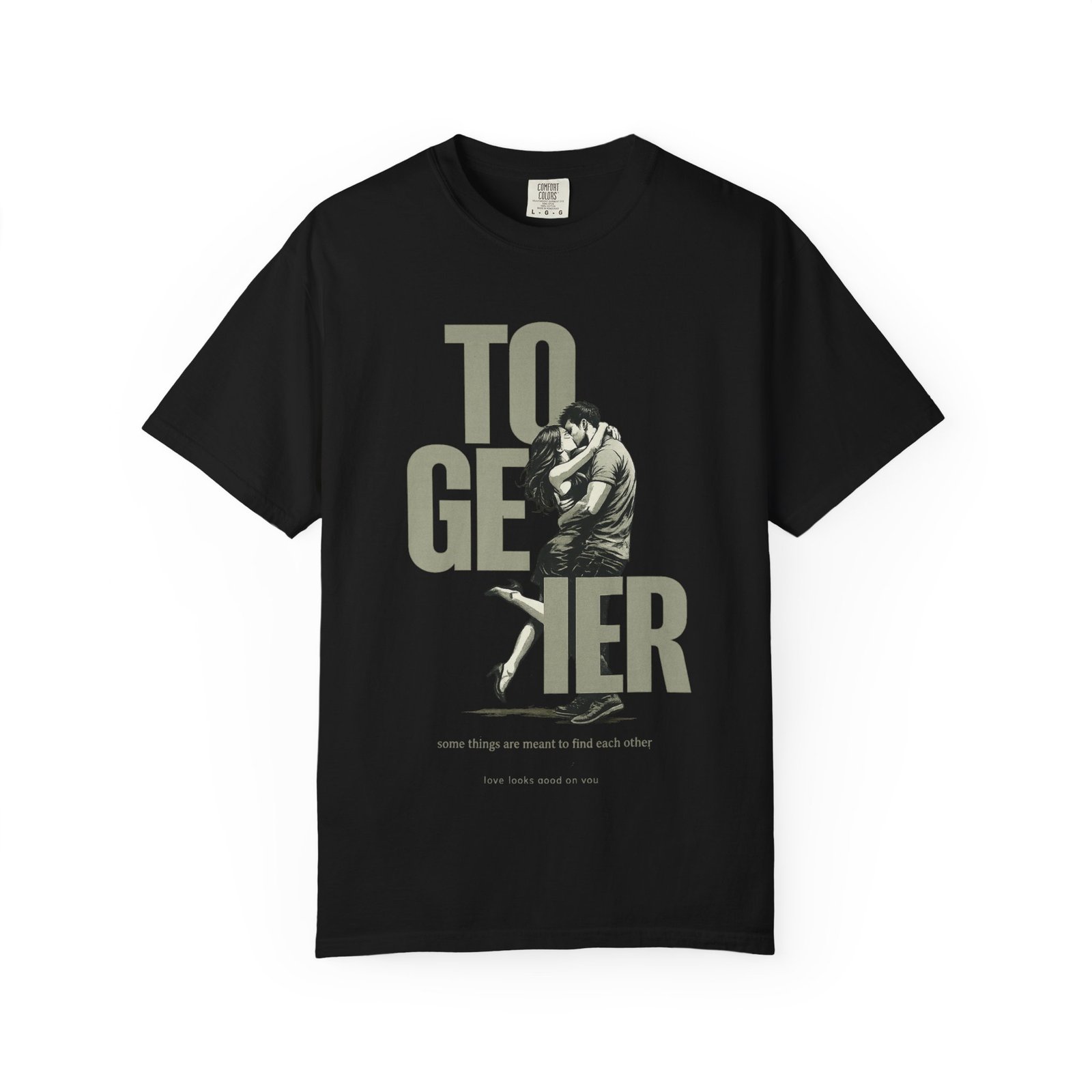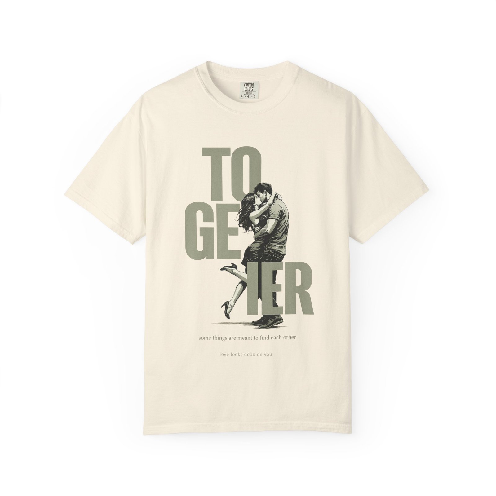 A soft, garment-dyed tee that pairs vintage romance with modern minimalism. The relaxed, heavyweight cotton drapes like a lived-in favorite while the muted typographic layout frames a nostalgic black-and-white photo of a couple embracing — the word “TOGETHER” split around them for quiet impact. Wear it when you want a subtle declaration of closeness: on slow mornings with coffee, at evening walks, or while flipping through old records. The dyed finish gives each shirt a unique, slightly worn-in hue and a supple hand that gets better with every wash. It’s the kind of shirt that settles into your rotation and carries a feeling — calm, connected, and quietly confident.