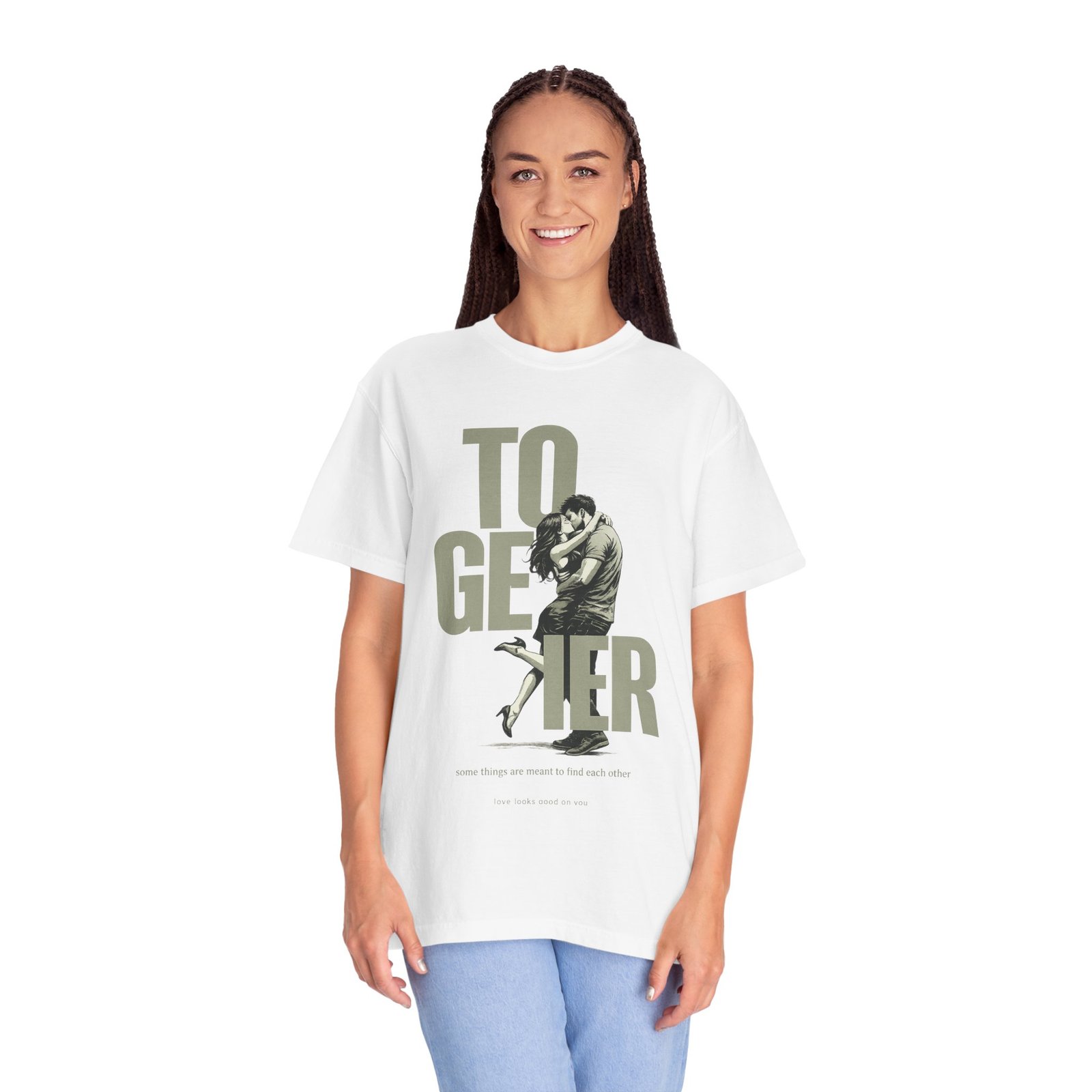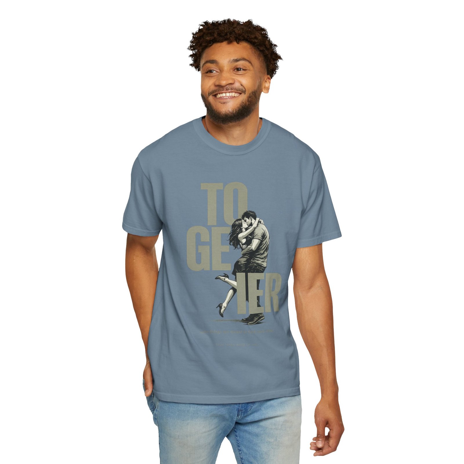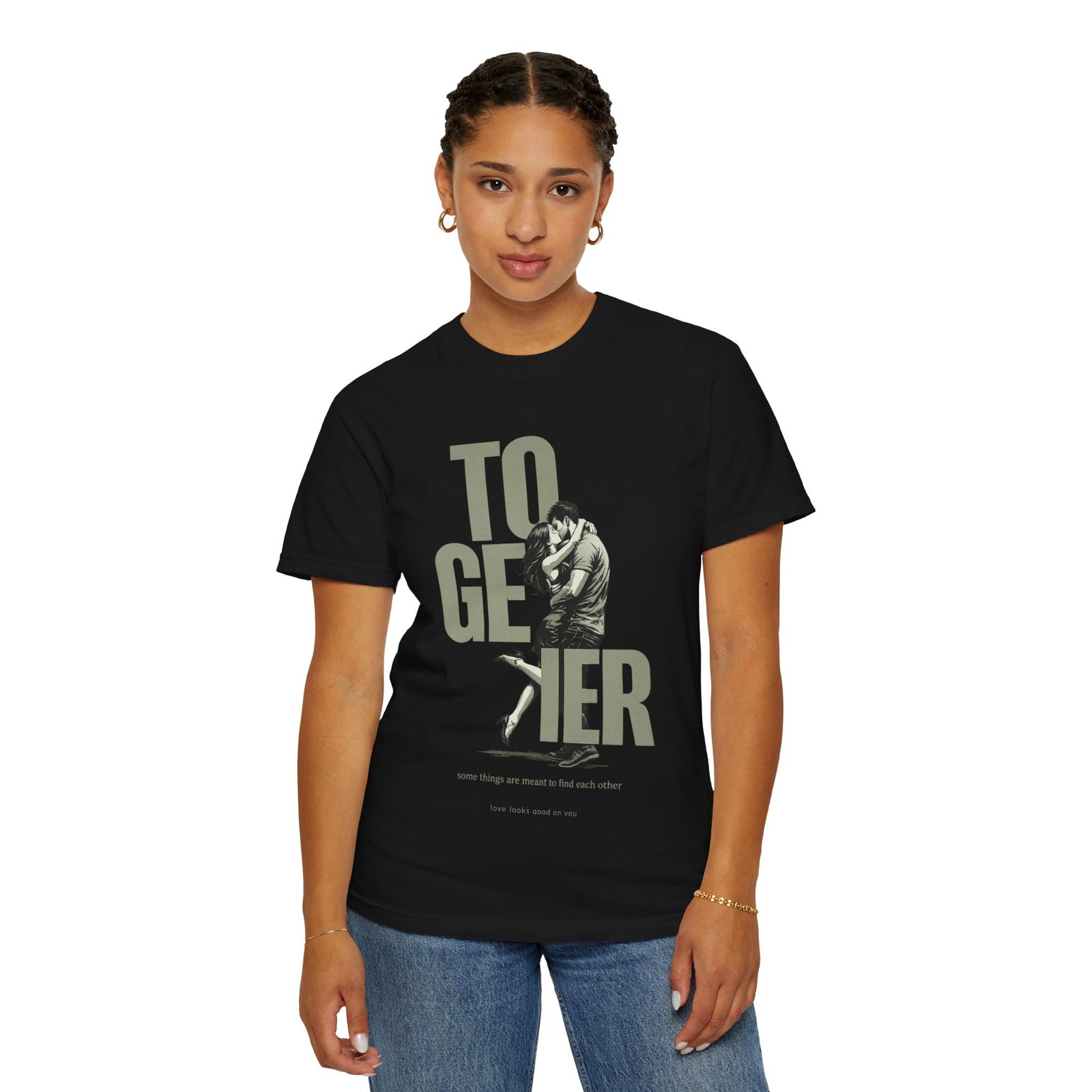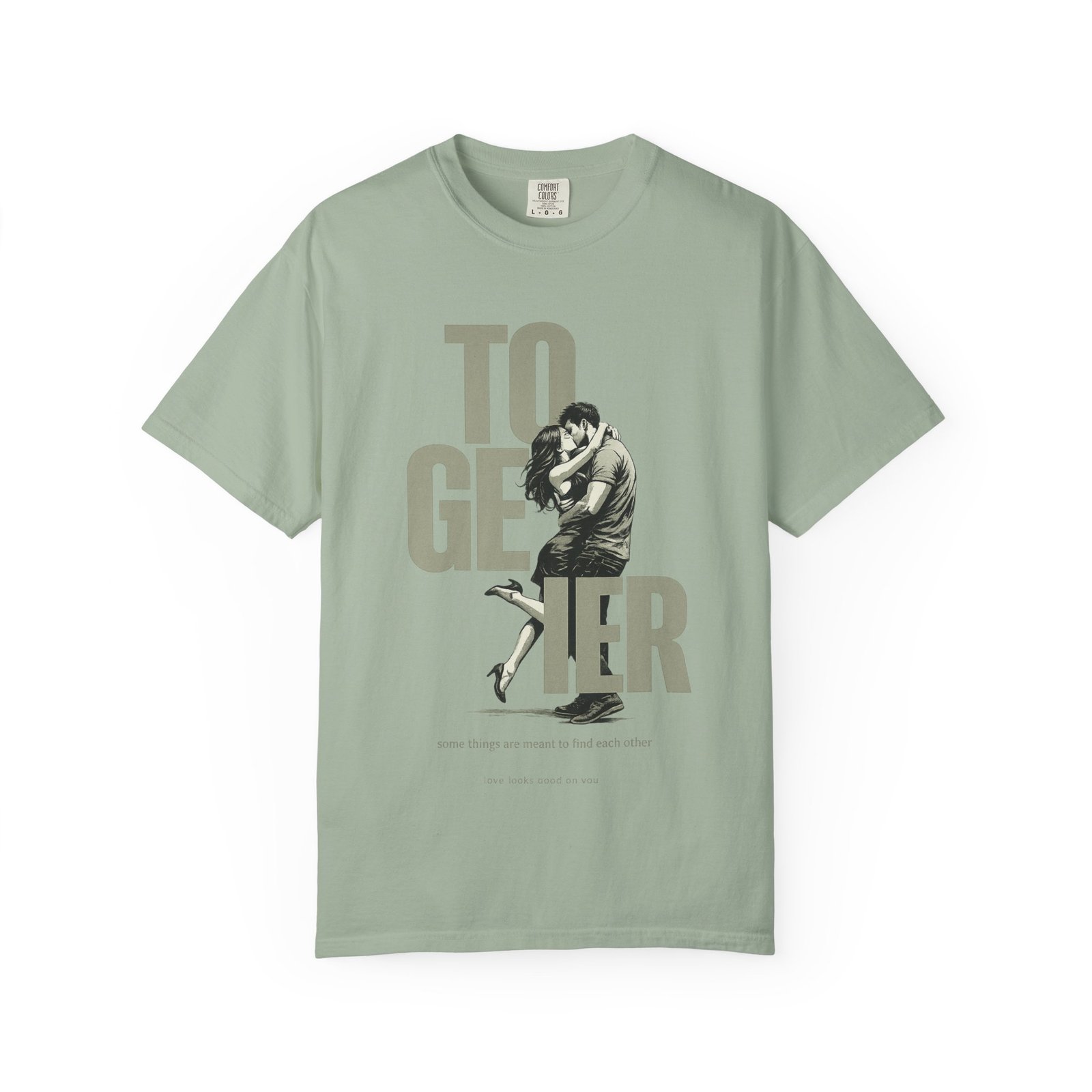 A soft, garment-dyed tee that pairs vintage romance with modern minimalism. The relaxed, heavyweight cotton drapes like a lived-in favorite while the muted typographic layout frames a nostalgic black-and-white photo of a couple embracing — the word “TOGETHER” split around them for quiet impact. Wear it when you want a subtle declaration of closeness: on slow mornings with coffee, at evening walks, or while flipping through old records. The dyed finish gives each shirt a unique, slightly worn-in hue and a supple hand that gets better with every wash. It’s the kind of shirt that settles into your rotation and carries a feeling — calm, connected, and quietly confident.