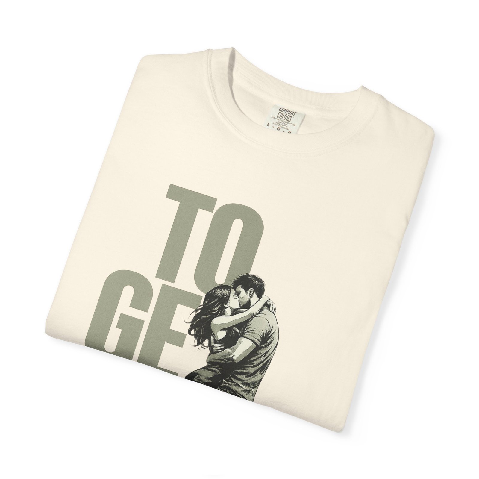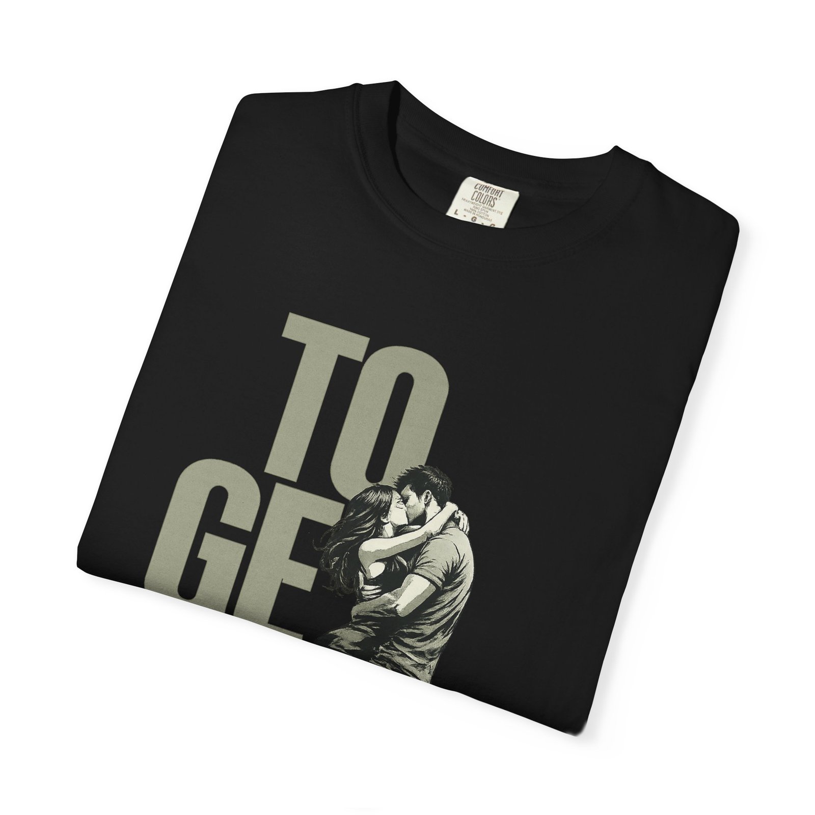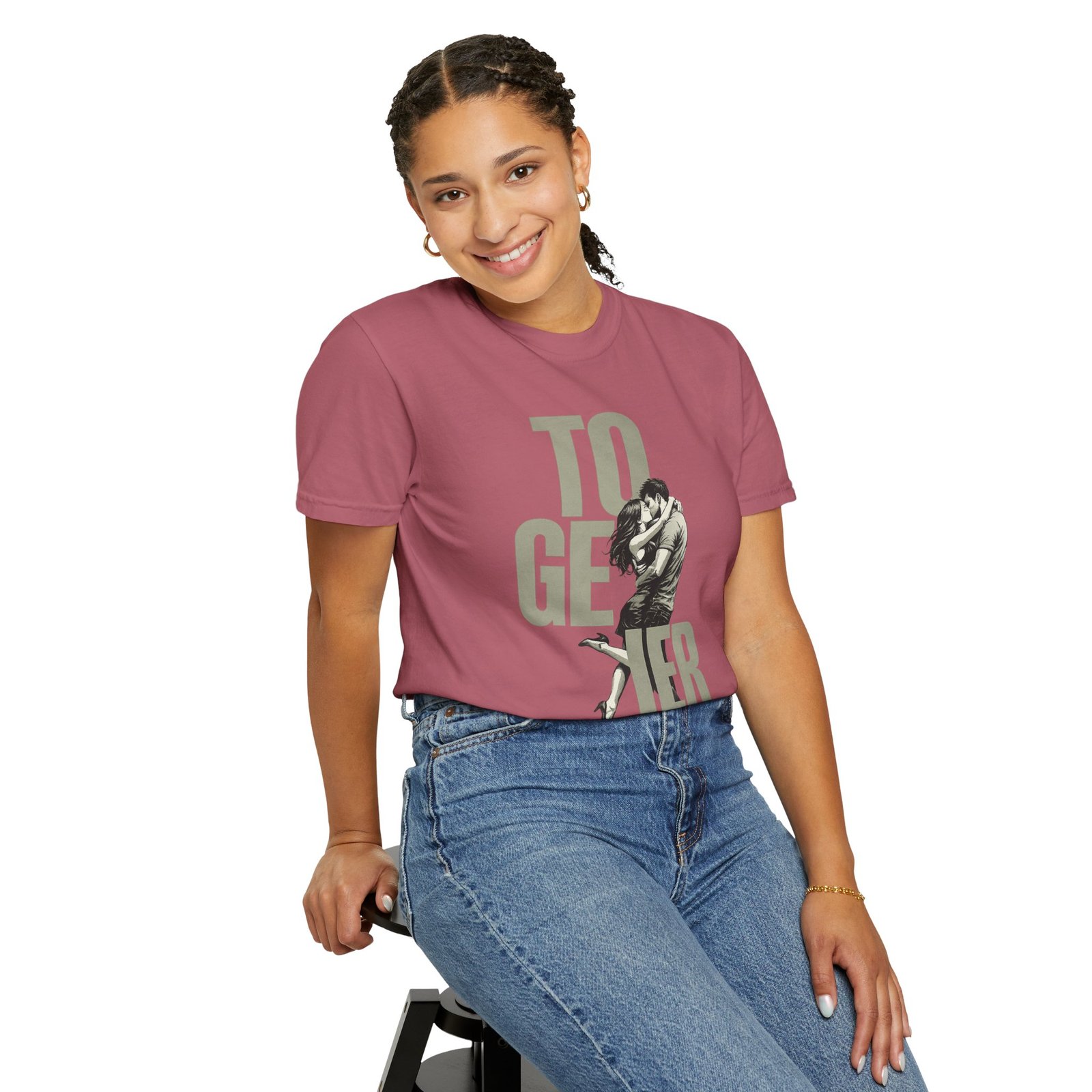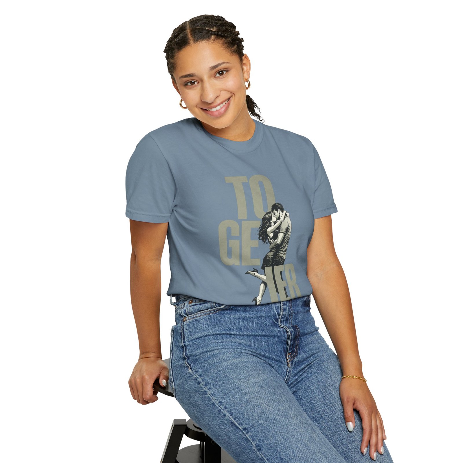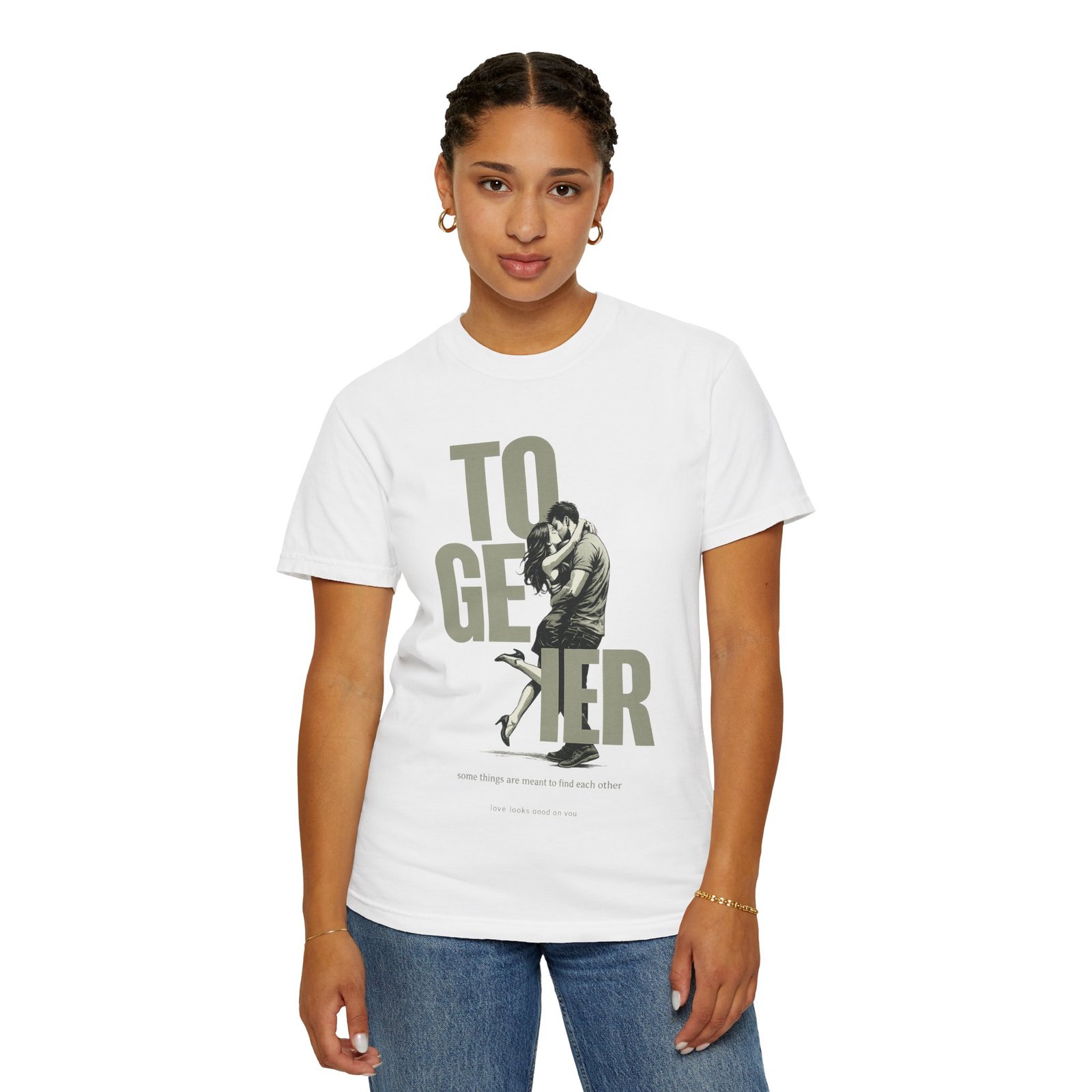 A soft, garment-dyed tee that pairs vintage romance with modern minimalism. The relaxed, heavyweight cotton drapes like a lived-in favorite while the muted typographic layout frames a nostalgic black-and-white photo of a couple embracing — the word “TOGETHER” split around them for quiet impact. Wear it when you want a subtle declaration of closeness: on slow mornings with coffee, at evening walks, or while flipping through old records. The dyed finish gives each shirt a unique, slightly worn-in hue and a supple hand that gets better with every wash. It’s the kind of shirt that settles into your rotation and carries a feeling — calm, connected, and quietly confident.