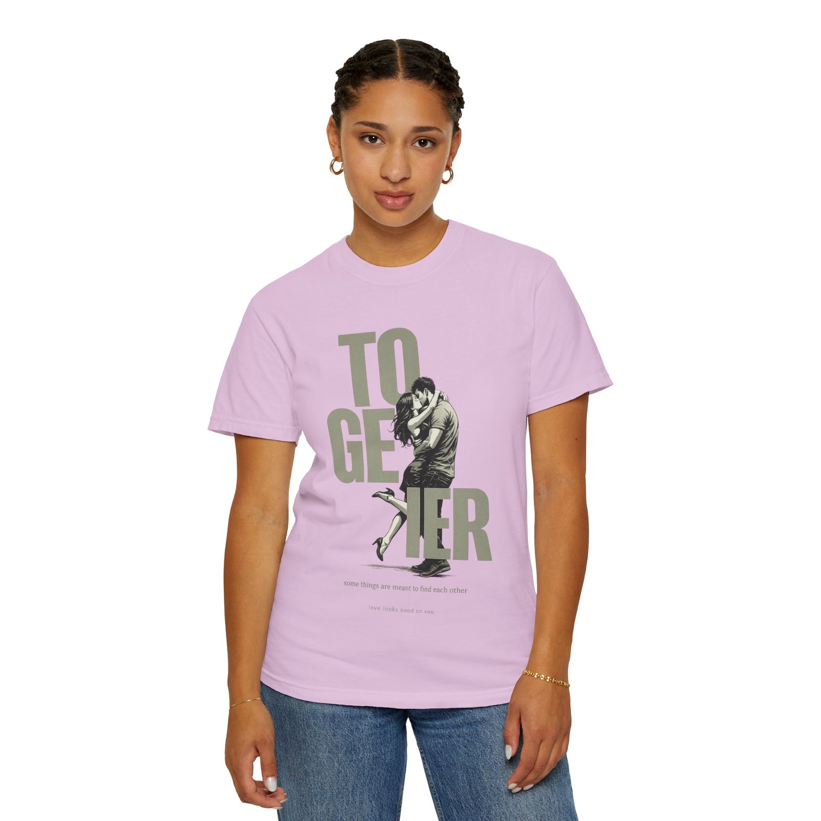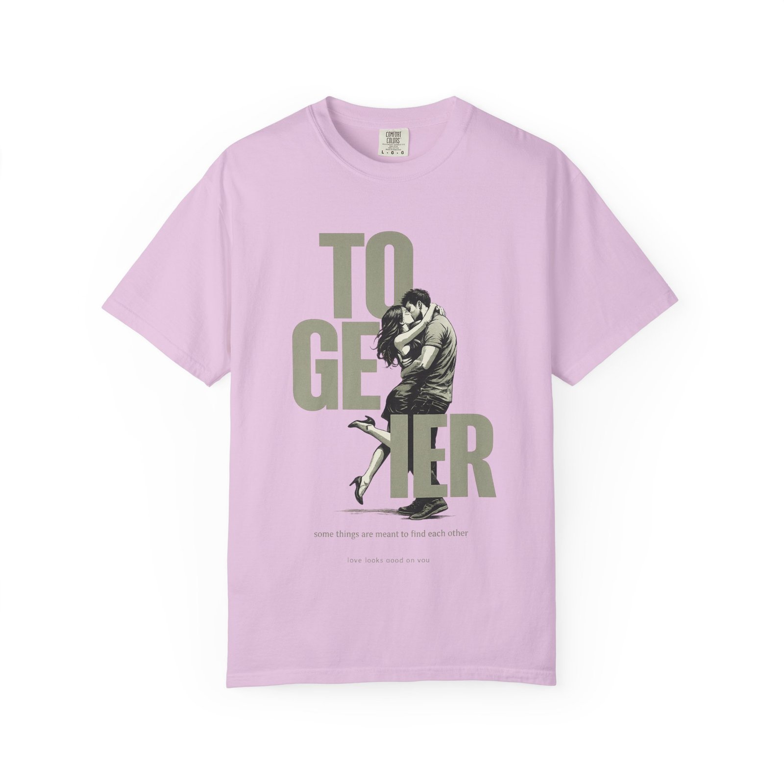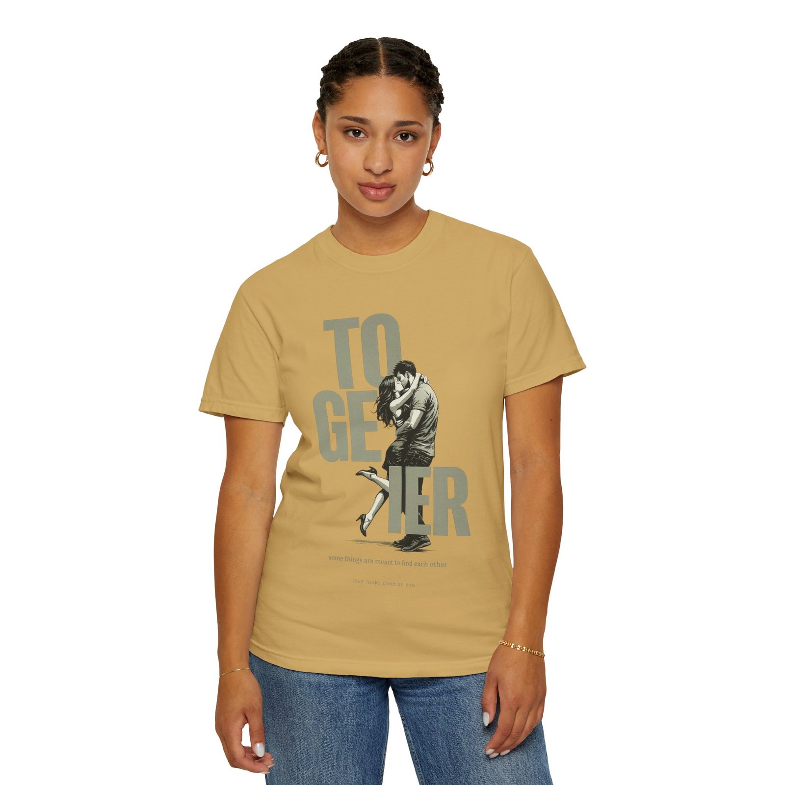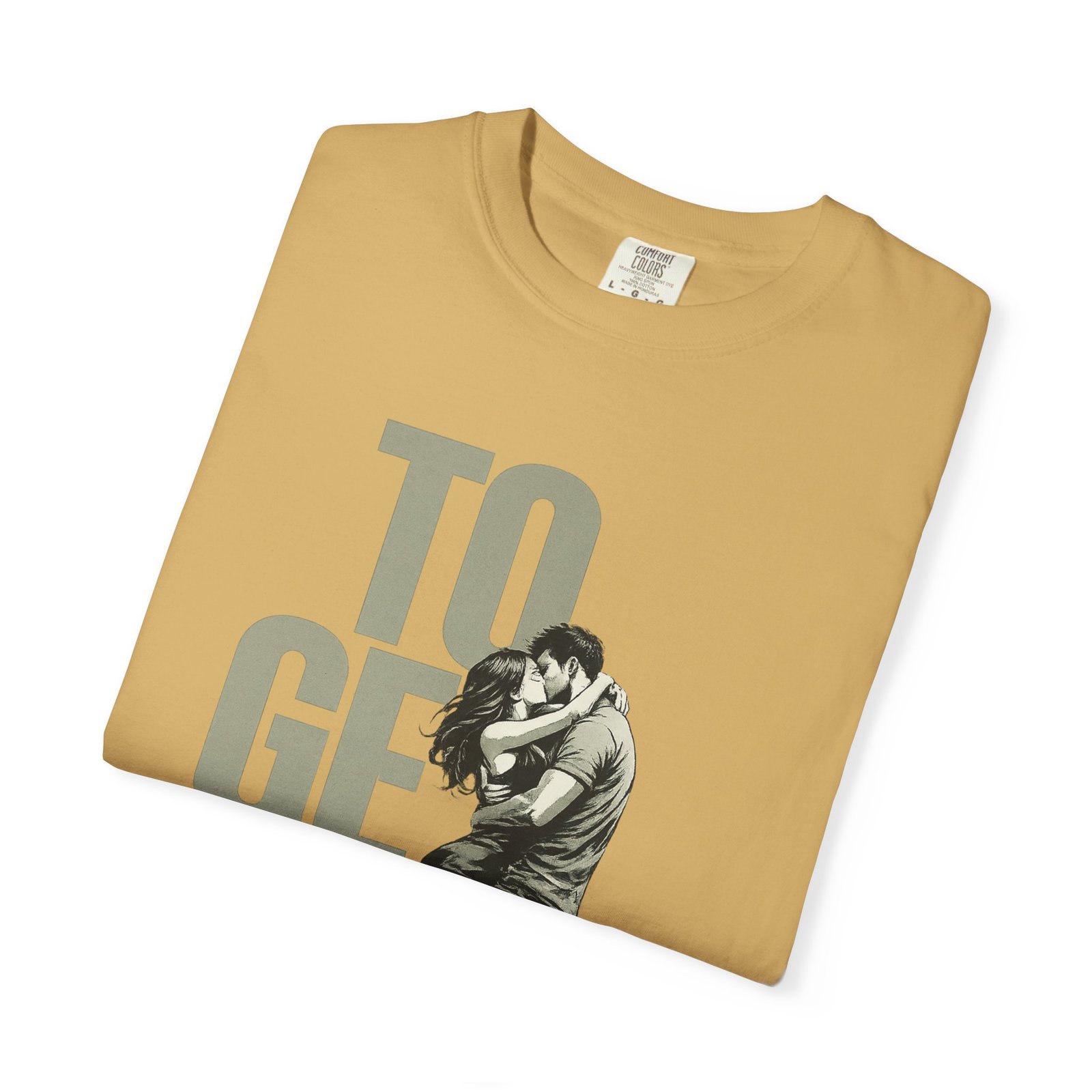 A soft, garment-dyed tee that pairs vintage romance with modern minimalism. The relaxed, heavyweight cotton drapes like a lived-in favorite while the muted typographic layout frames a nostalgic black-and-white photo of a couple embracing — the word “TOGETHER” split around them for quiet impact. Wear it when you want a subtle declaration of closeness: on slow mornings with coffee, at evening walks, or while flipping through old records. The dyed finish gives each shirt a unique, slightly worn-in hue and a supple hand that gets better with every wash. It’s the kind of shirt that settles into your rotation and carries a feeling — calm, connected, and quietly confident.