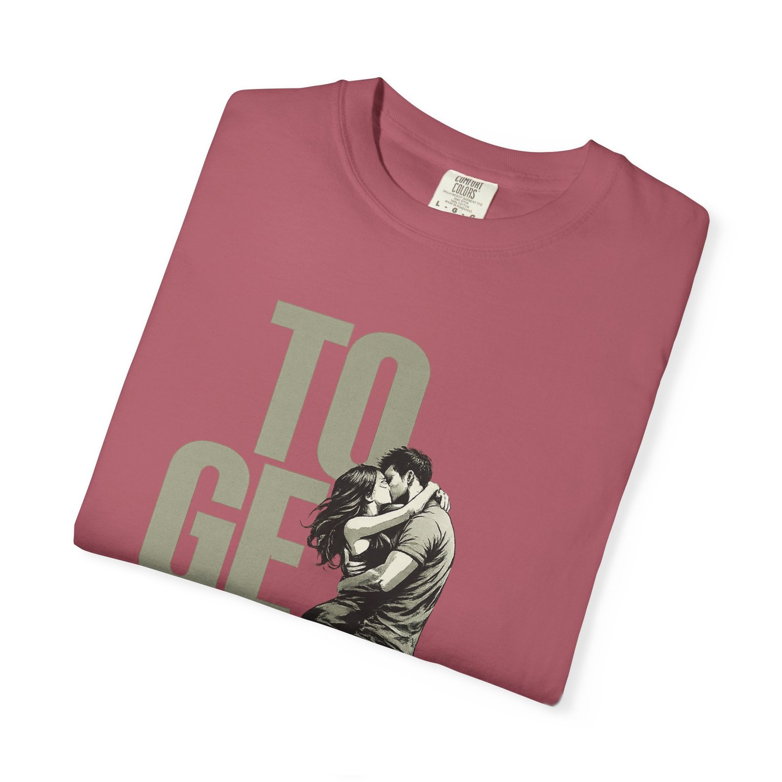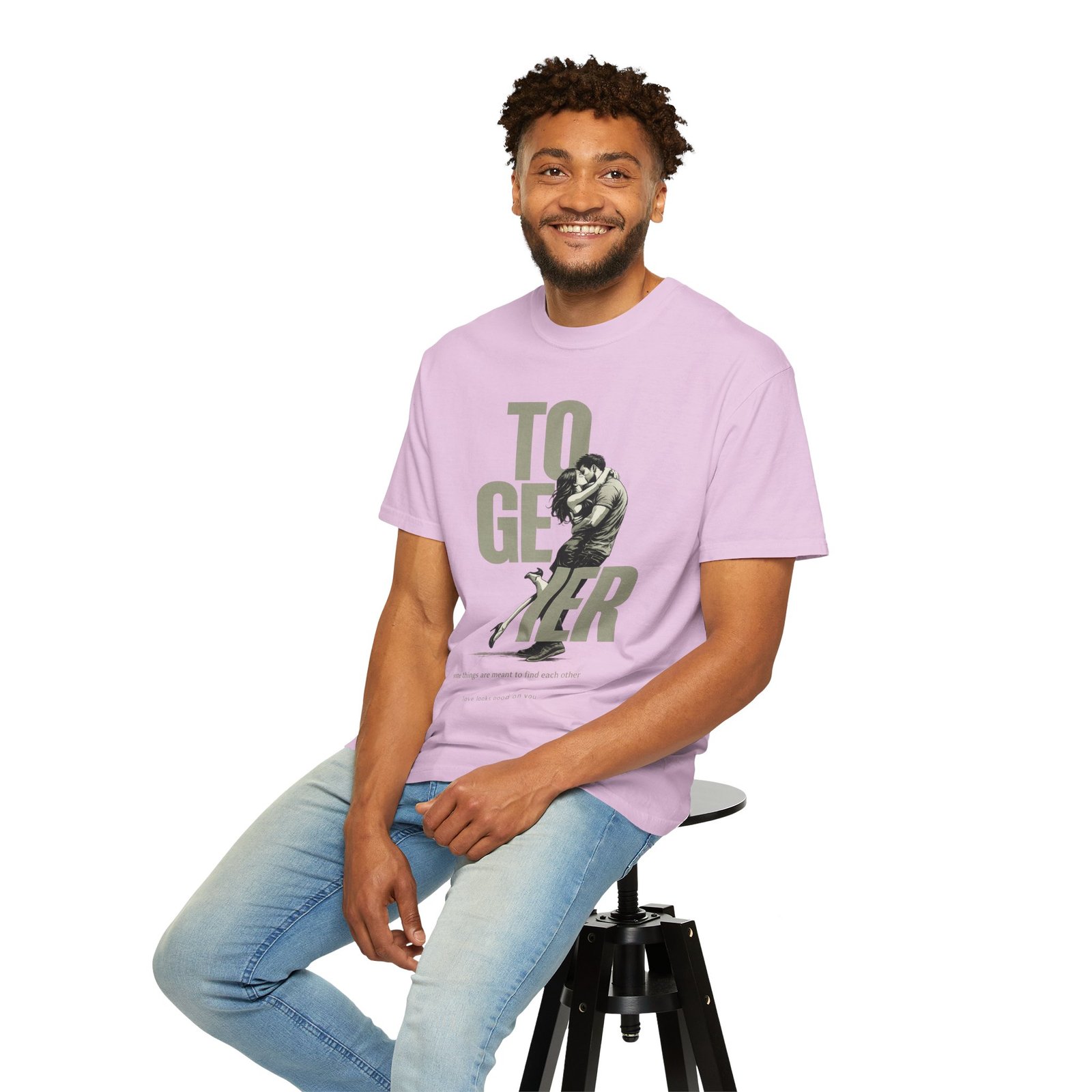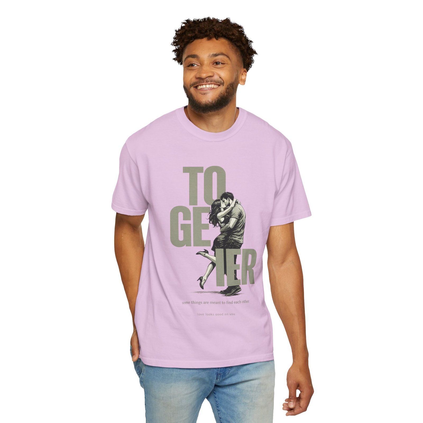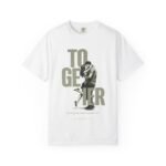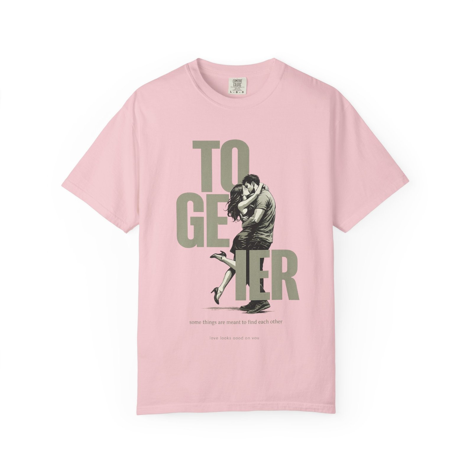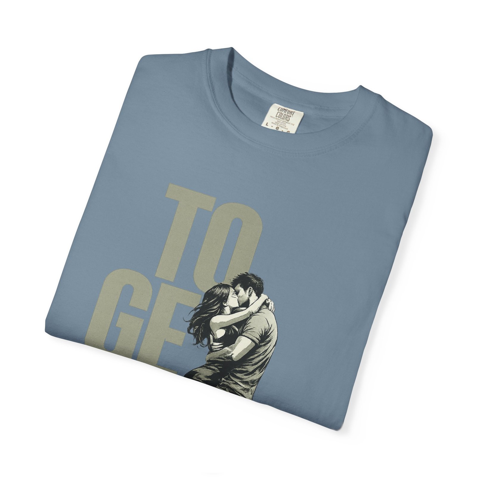 A soft, garment-dyed tee that pairs vintage romance with modern minimalism. The relaxed, heavyweight cotton drapes like a lived-in favorite while the muted typographic layout frames a nostalgic black-and-white photo of a couple embracing — the word “TOGETHER” split around them for quiet impact. Wear it when you want a subtle declaration of closeness: on slow mornings with coffee, at evening walks, or while flipping through old records. The dyed finish gives each shirt a unique, slightly worn-in hue and a supple hand that gets better with every wash. It’s the kind of shirt that settles into your rotation and carries a feeling — calm, connected, and quietly confident.