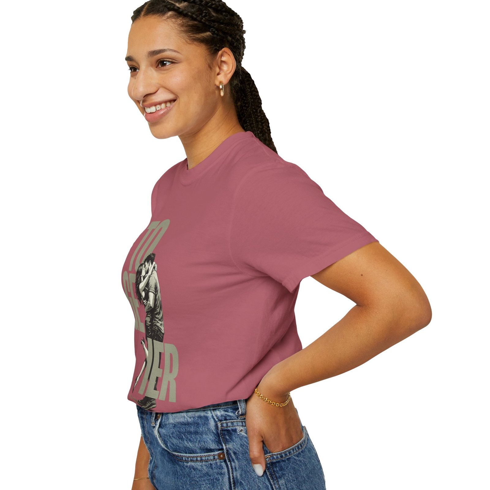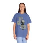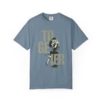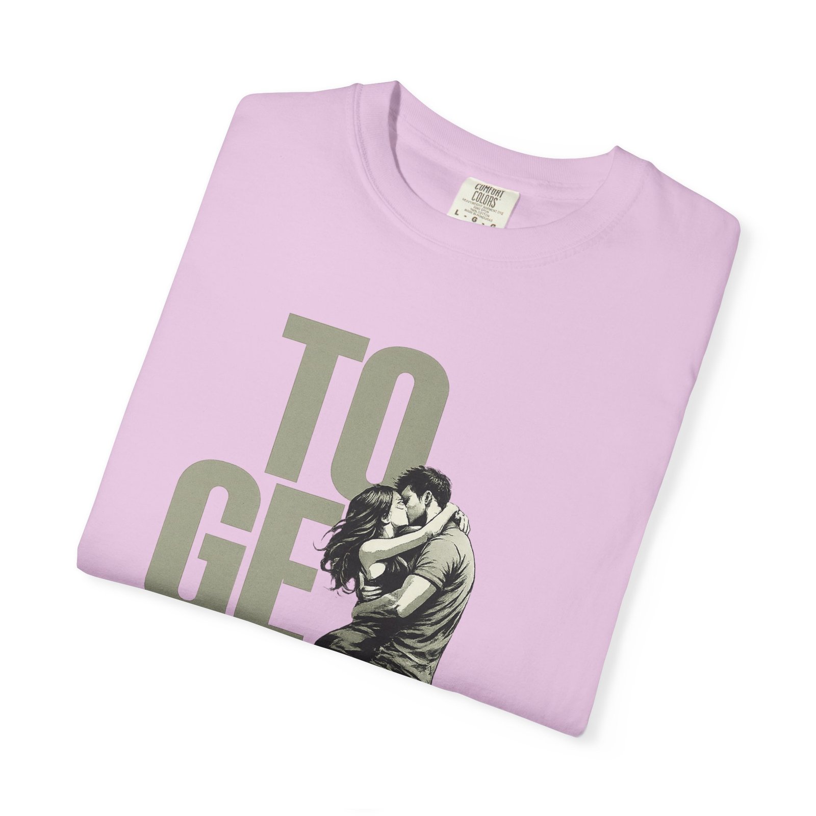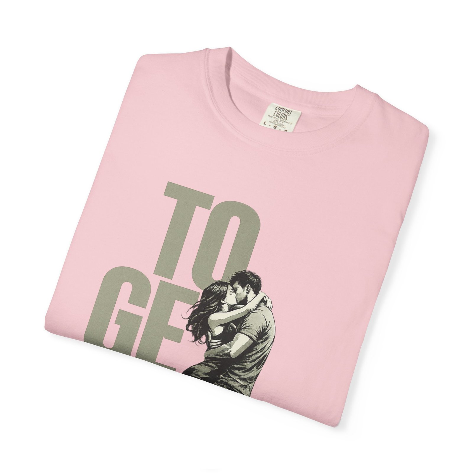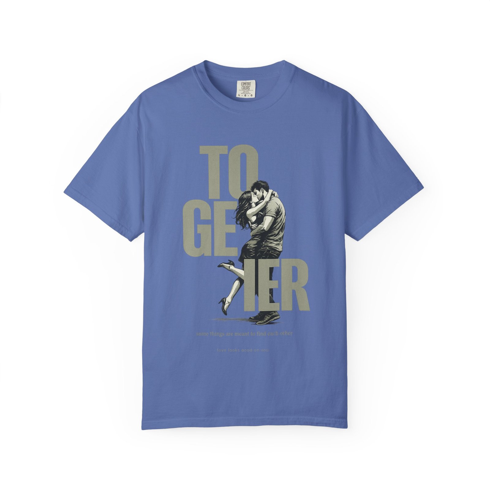 A soft, garment-dyed tee that pairs vintage romance with modern minimalism. The relaxed, heavyweight cotton drapes like a lived-in favorite while the muted typographic layout frames a nostalgic black-and-white photo of a couple embracing — the word “TOGETHER” split around them for quiet impact. Wear it when you want a subtle declaration of closeness: on slow mornings with coffee, at evening walks, or while flipping through old records. The dyed finish gives each shirt a unique, slightly worn-in hue and a supple hand that gets better with every wash. It’s the kind of shirt that settles into your rotation and carries a feeling — calm, connected, and quietly confident.